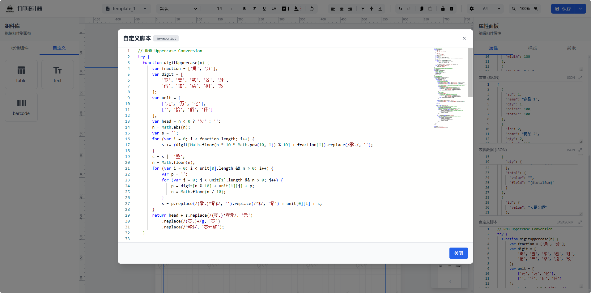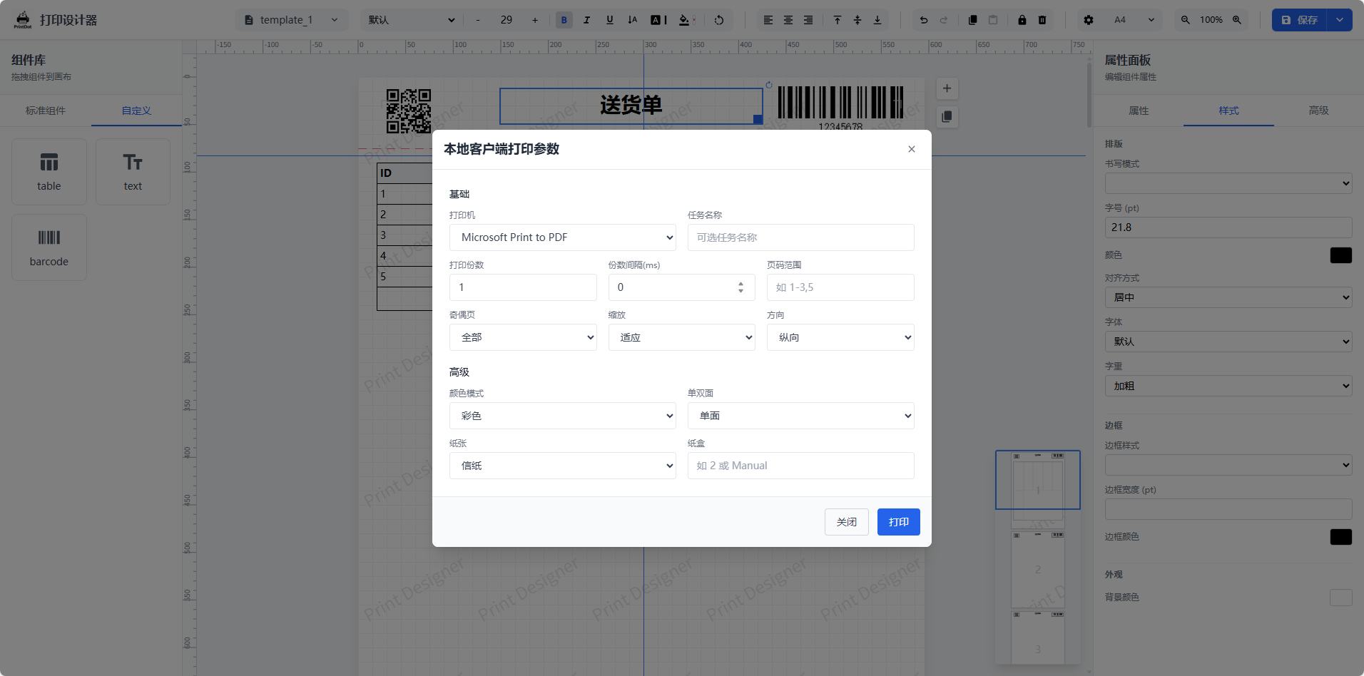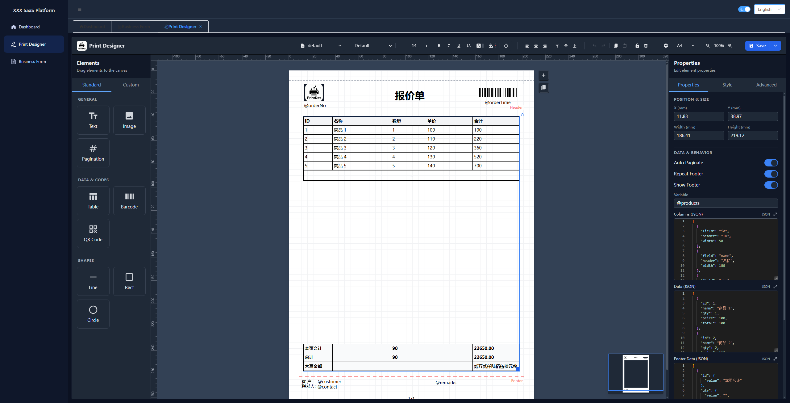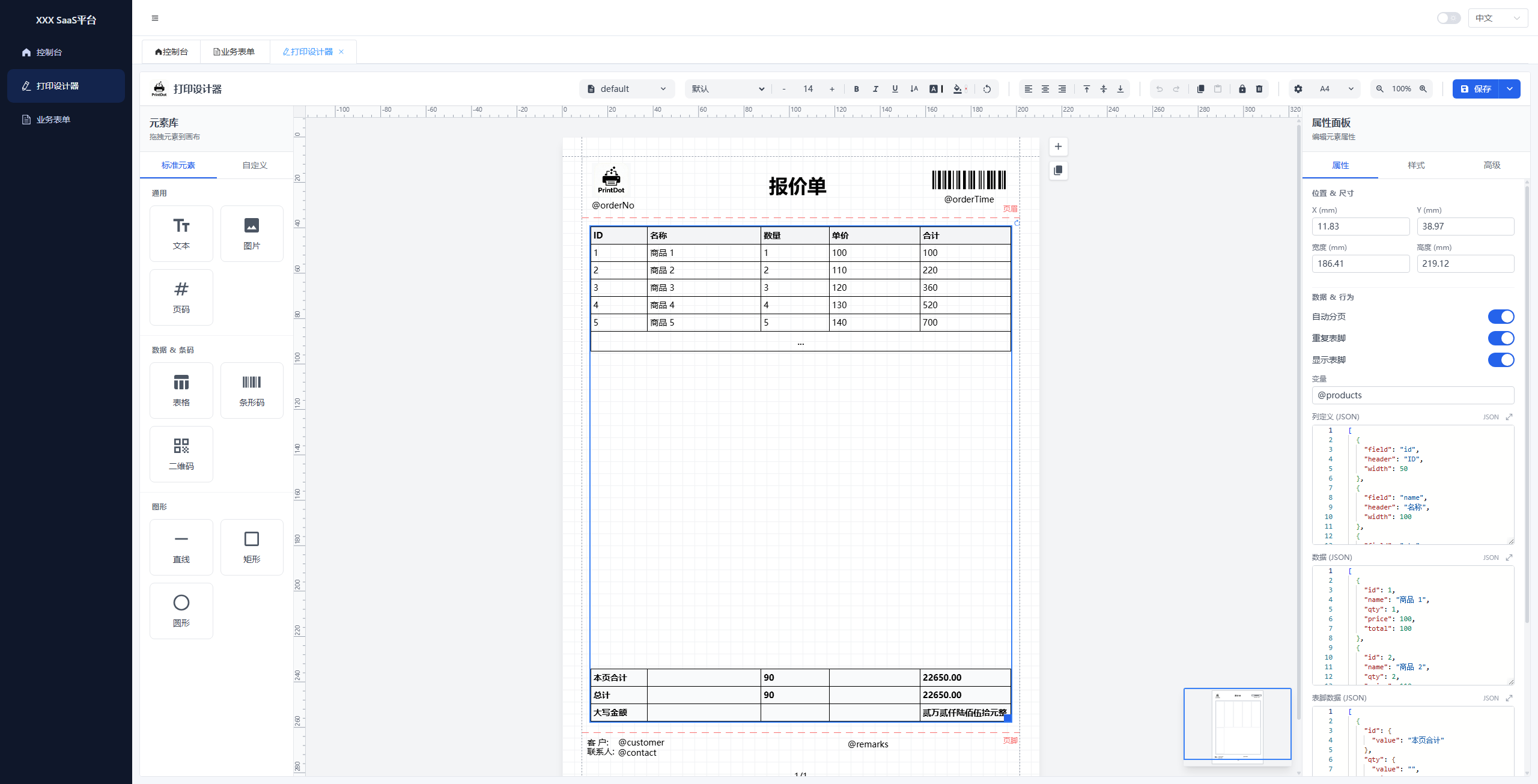 拖拽式页面编辑,支持文本、图片、条码、二维码、表格、形状