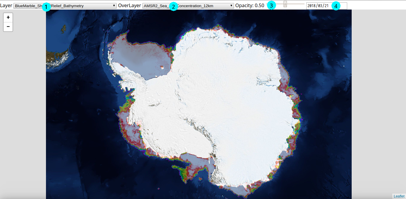 Anatarctica maps based on leaflet.js, proj4leaflet and images from GIBS of NASA.