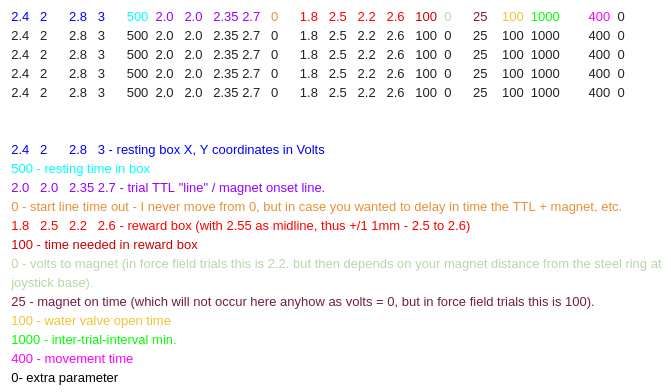 The experimental parameters is a text file that you load, so you can customize this to your system/needs. You specify a resting home box, start "box - i.e. when it crosses a point in Y space it will trigger a trial start", end box, delay times, water value open times, magnet on time, and magnet force. It's easy to customize too, if you want to make changes. Each line in the text file is a trial. i.e.;