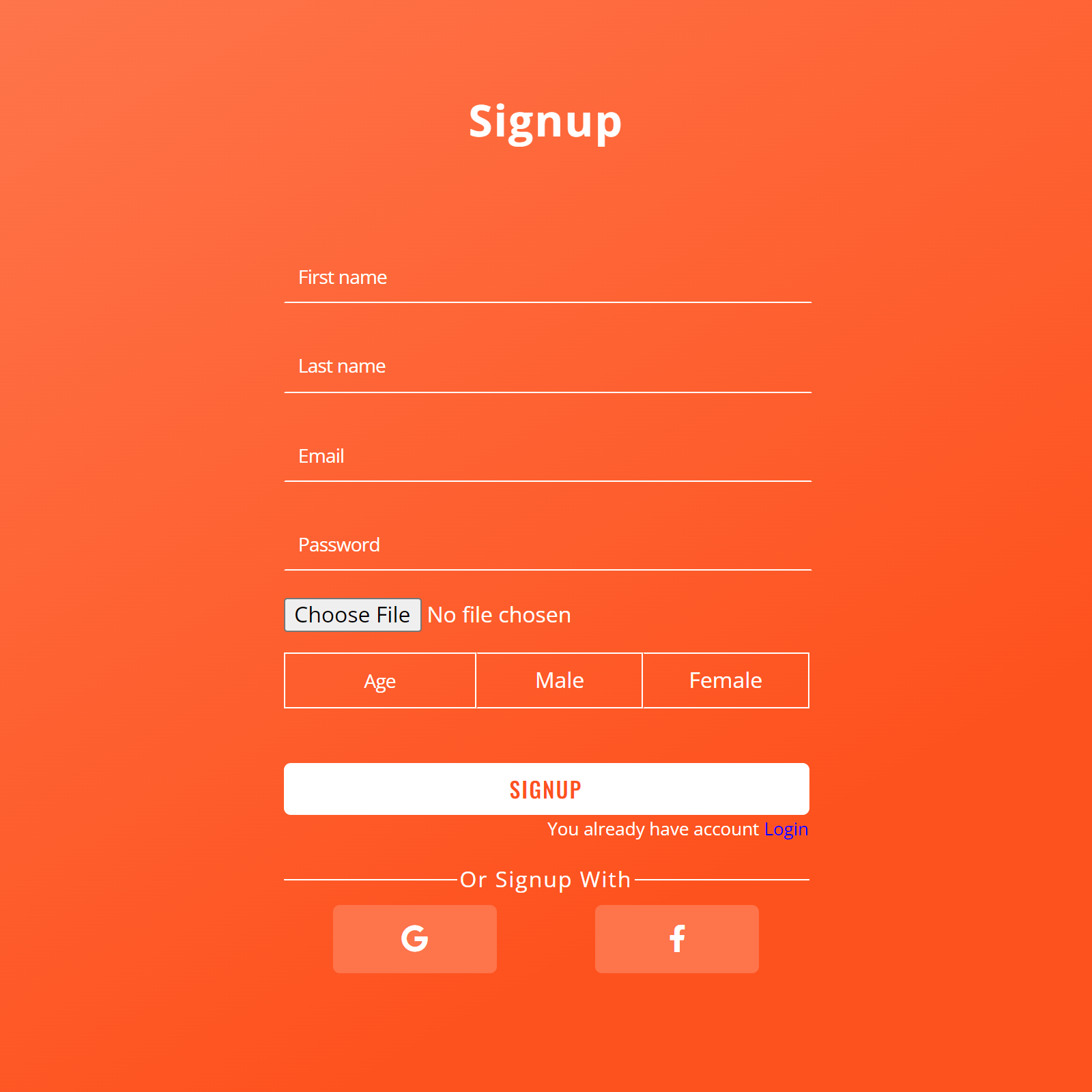 To signup, enter your first name, last name, email, password, chose user avatar, age, sex and click on "SIGNUP" button.