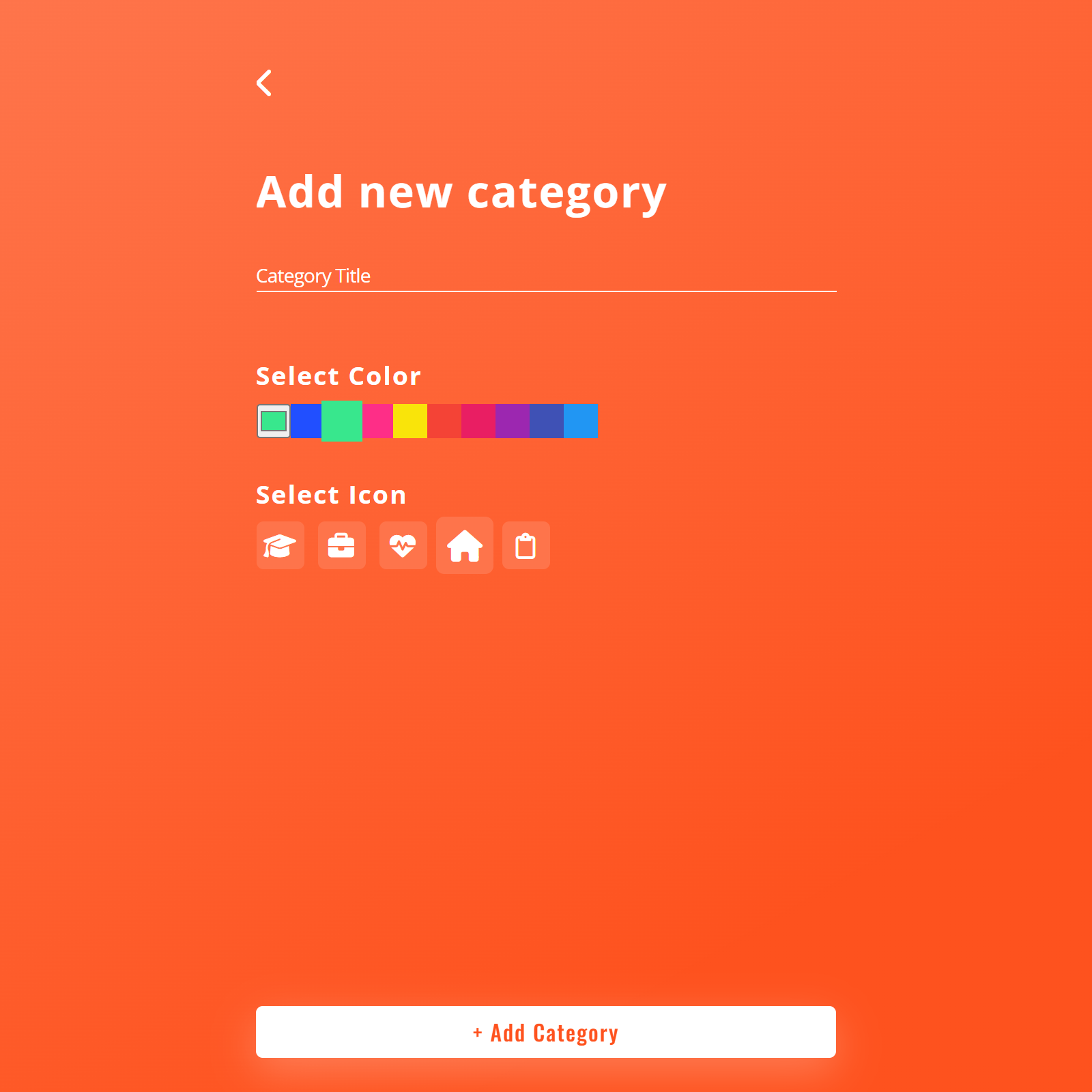 To create a categiry list, click the "+" button then add category plus button. Enter a name for the category, chose the category color, chose category icon, and click the "+ ADD CATEGORY" button.