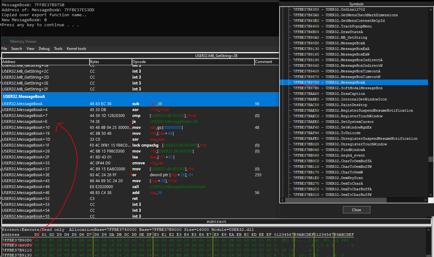 The screencap following shows what it looks like to modify a function name at runtime: We can see that the disassembler thinks MessageBoxA is located at both 0x7FFBE37B90D0 and 0x7FFBE37B9750.