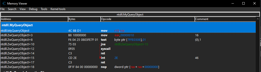 The second screencap shows renaming NtQueryObject to MyQueryObject. Processes that try to query the address of NtQueryObject using GetProcAddress will now fail.