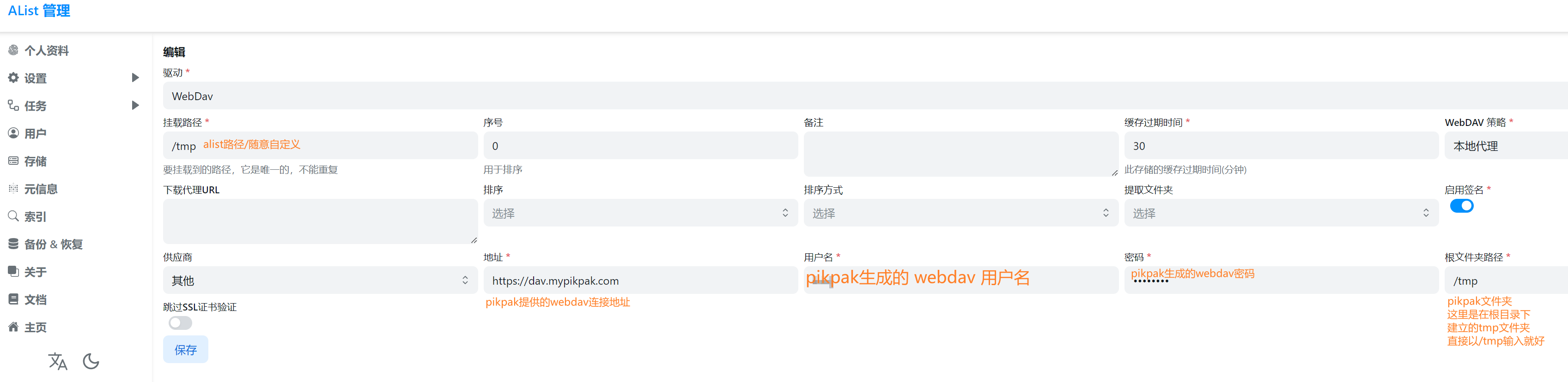 首先你要有pikpak的会员,在pikpak设置中有个实验室功能,里面有webdav相关设置和连接用的账号密码信息,启用这个功能;alist用webdav的方式挂载pikpak,比如你的pikpak文件夹结构是在根目录有个“test”文件夹,那么挂载的时候就填路径“/test”即可,填写pikpak提供的webdav的连接地址、账号和密码就可以了;