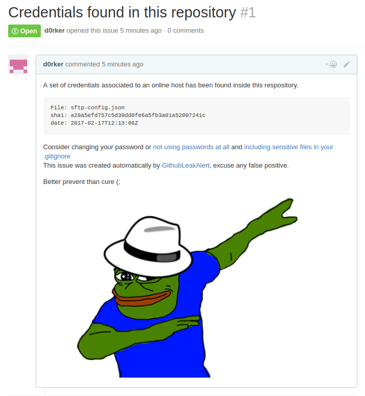 GithubLeakAlert monitor GitHub to find credential associated with an host. Then it creates an issue in the repository to warn it's owner he might have unknowingly published his password.