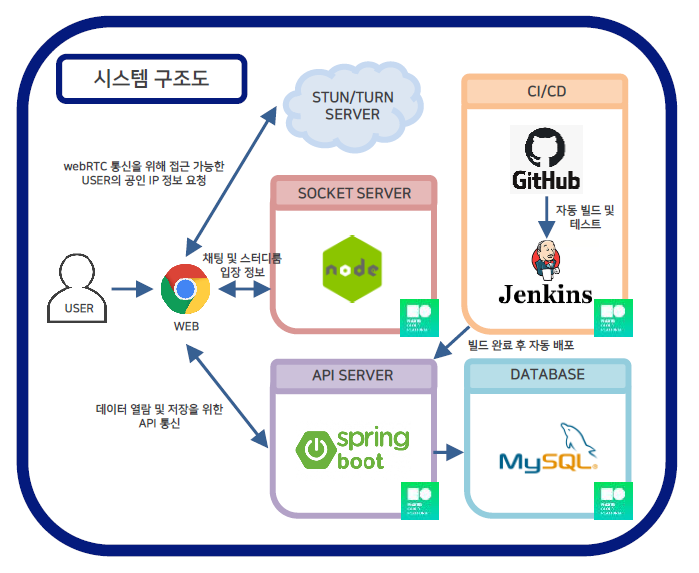 webRTC 통신 구조 중 Mesh구조를 선택하여 높은 실시간성을 보장합니다.