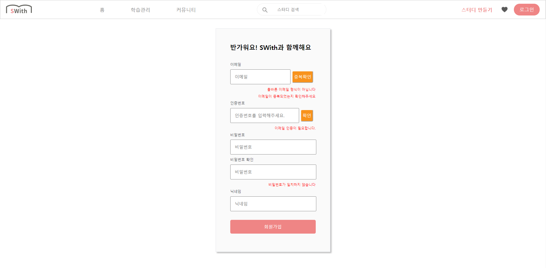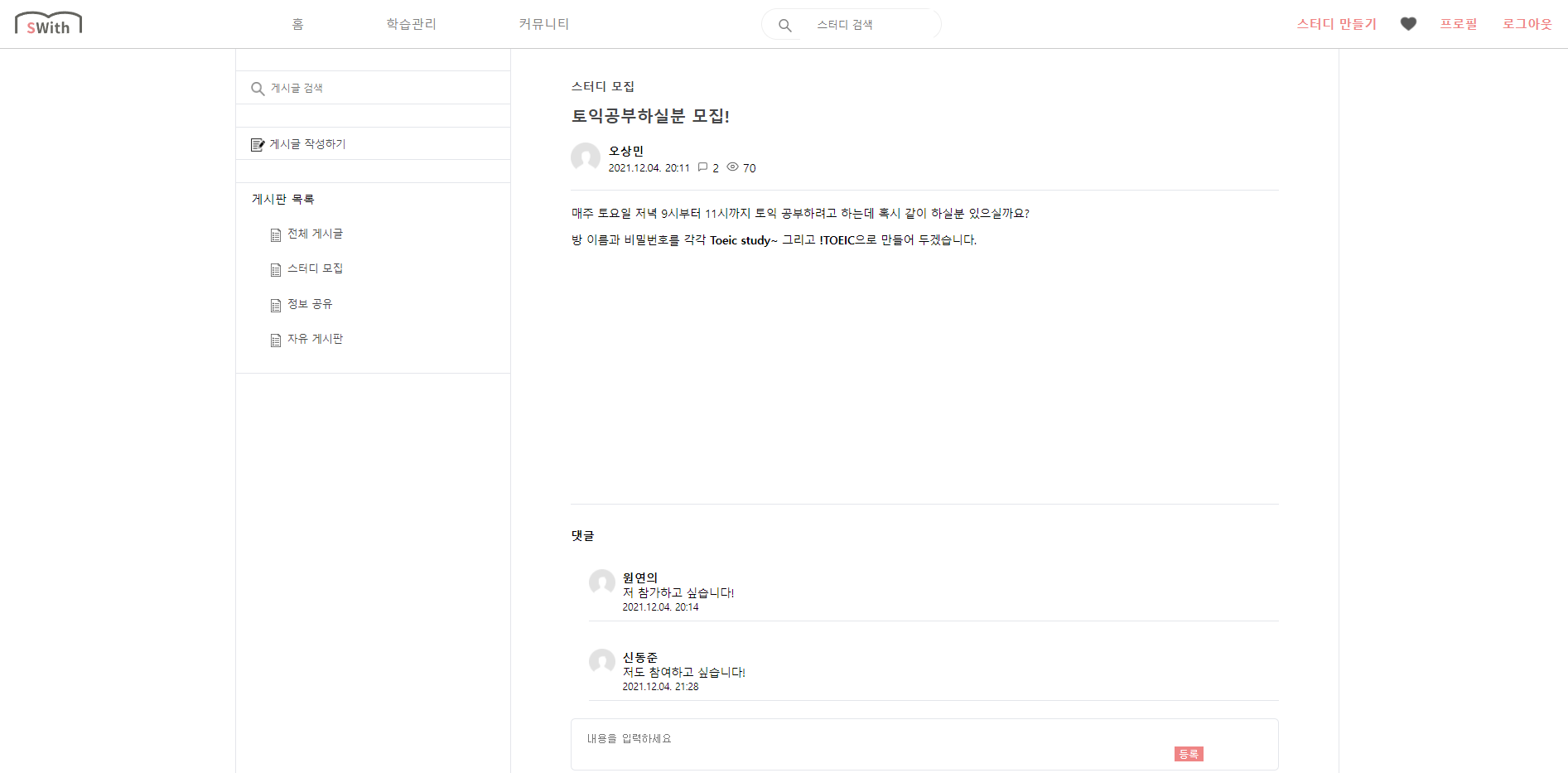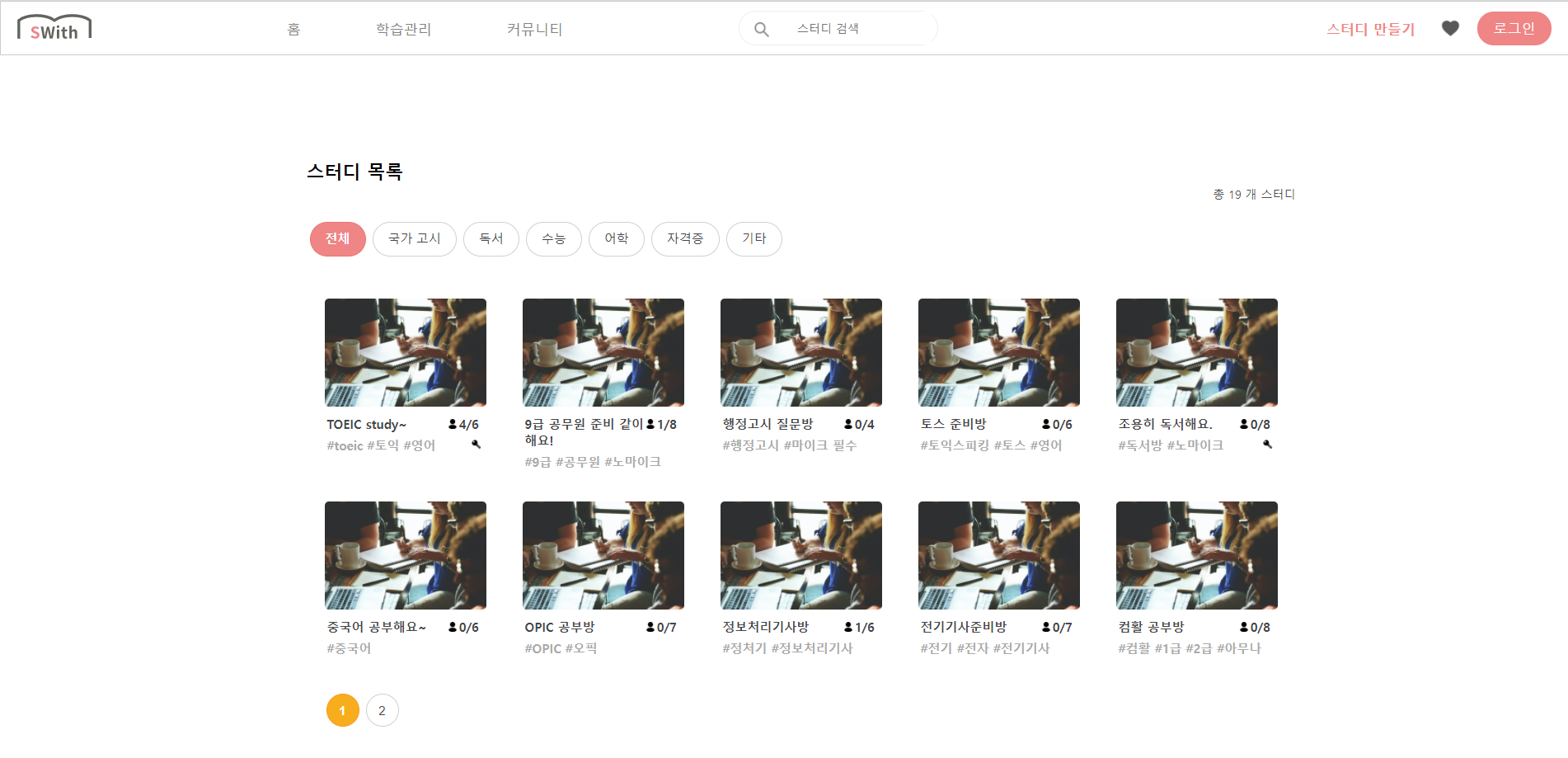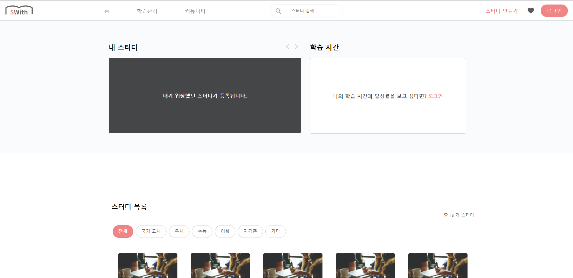 먼저, 함께 공부할 사람을 찾기 위해선 특정 커뮤니티에 가입해 원하는 공부목적을 가진 사람들을 모아야 하지만 쉽게 찾기가 어렵습니다. 또한 Zoom과 Google Meet 같은 화상회의 플랫폼은 다른사람의 초대나 입장 권한을 받아야 참가할 수 있어 단순 공부만을 하는 데엔 불편함이 있으며, 공부계획을 세울 때 함께 공부하는 사람들의 공부법을 참고하기 힘듭니다. 따라서 이러한 문제를 해결하기 위해 SWith은 함께 공부할 사람을 모으고 관리할 수 있도록 커뮤니티 서비스를 제공합니다. 또한 WebRTC 기반의 화상공유 플랫폼으로 다른 사람들과 실시간 소통을 할 수 있고, 자유롭게 누구나 참여가 가능합니다. 학습관리 서비스로 자신의 공부방법을 세울 수 있으며, 다른 사람들의 공부방식도 참고할 수 있습니다.