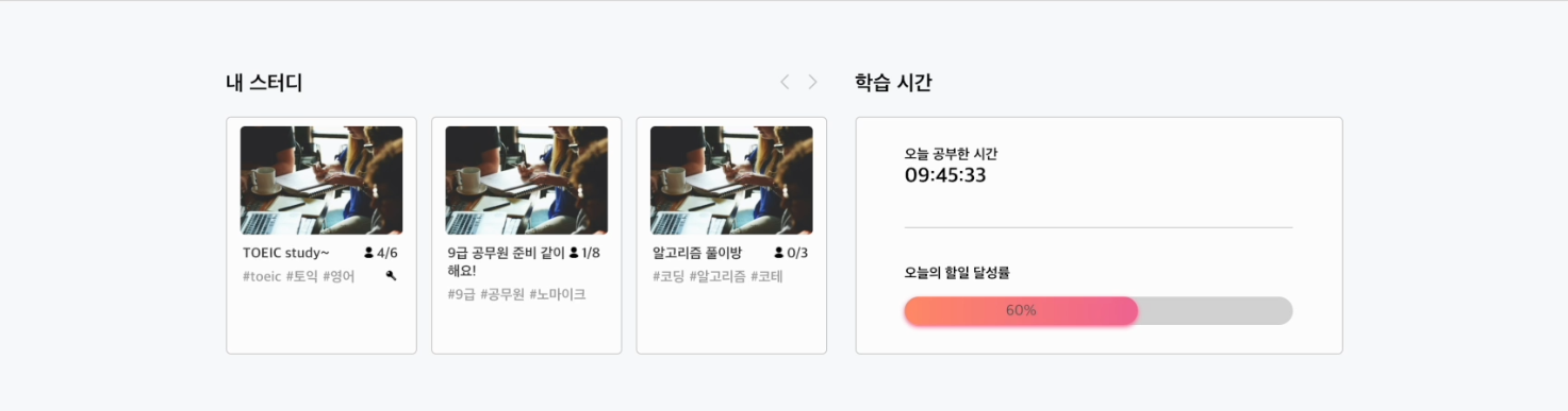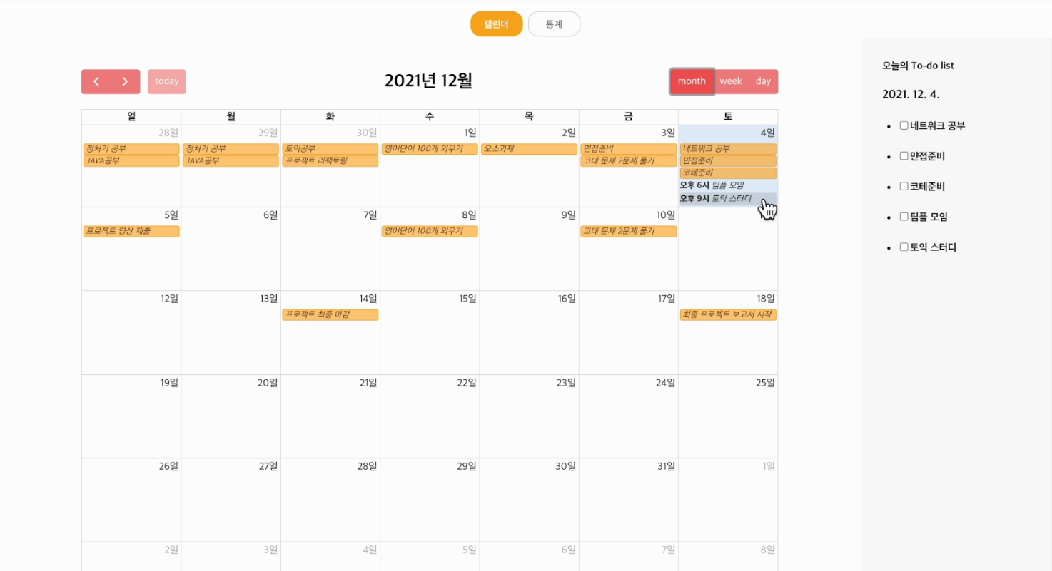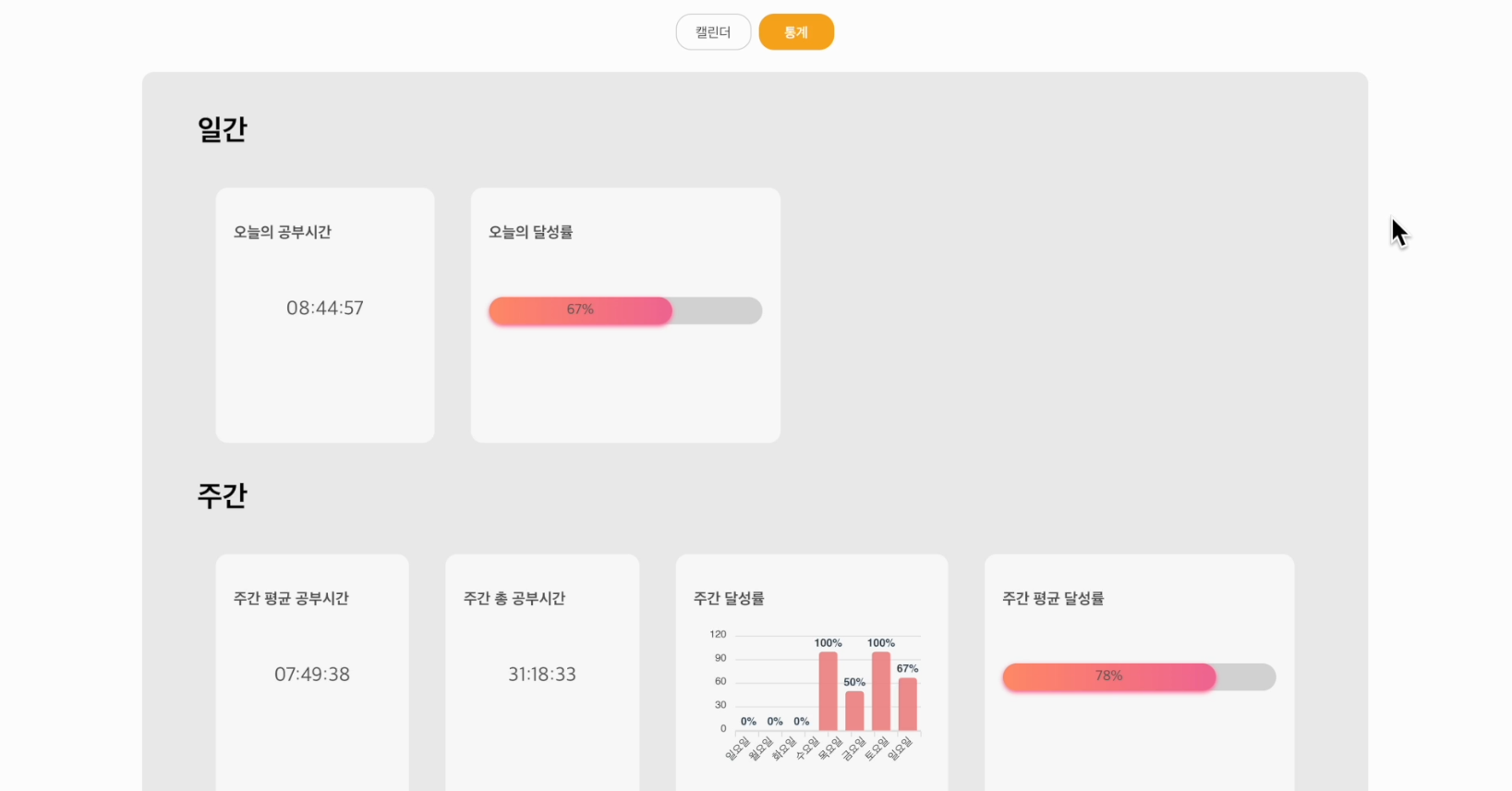 웹앱 기반의 캘린더 오픈소스인 FullCalendar와 그래프 오픈소스인 ApexCharts를 이용하여 사용자에게 학습 관리 및 학습 통계에 대한 편의성 제공하였습니다.