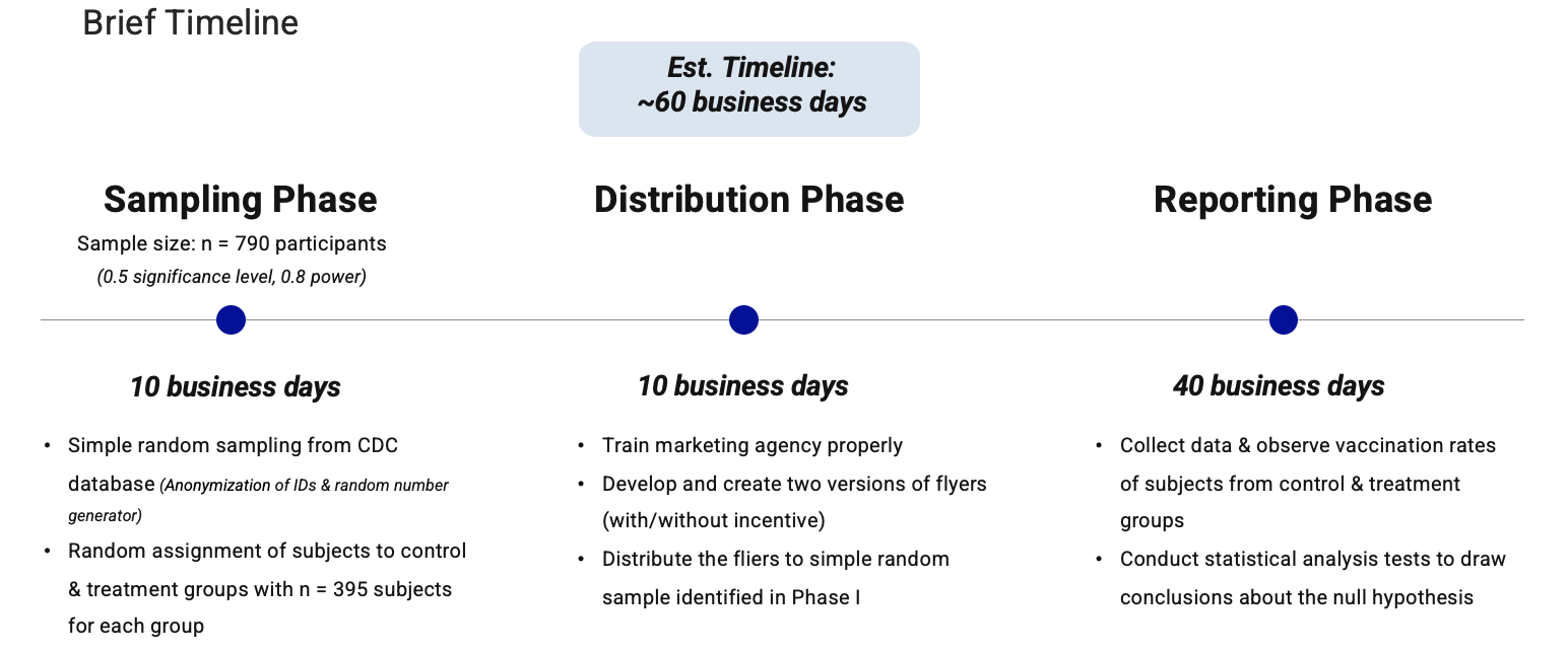 Null Hypothesis: The proportion of participants who get at least one dose of the COVID-19 vaccine will be the same between the control group (defined as participants who were mailed a flyer without an incentive) and the treatment group (defined as the participants who were sent a flyer with an incentive)