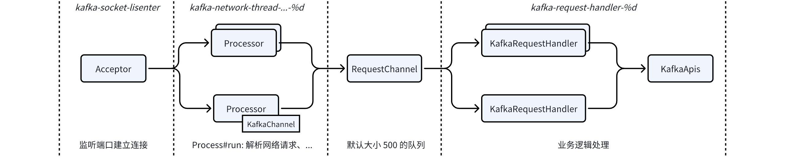 kafka-socket-listener corresponds to the Boss EventLoopGroup: responsible for accepting client connections. When a new connection arrives, the Boss EventLoopGroup accepts the connection and registers it with the Worker EventLoopGroup;