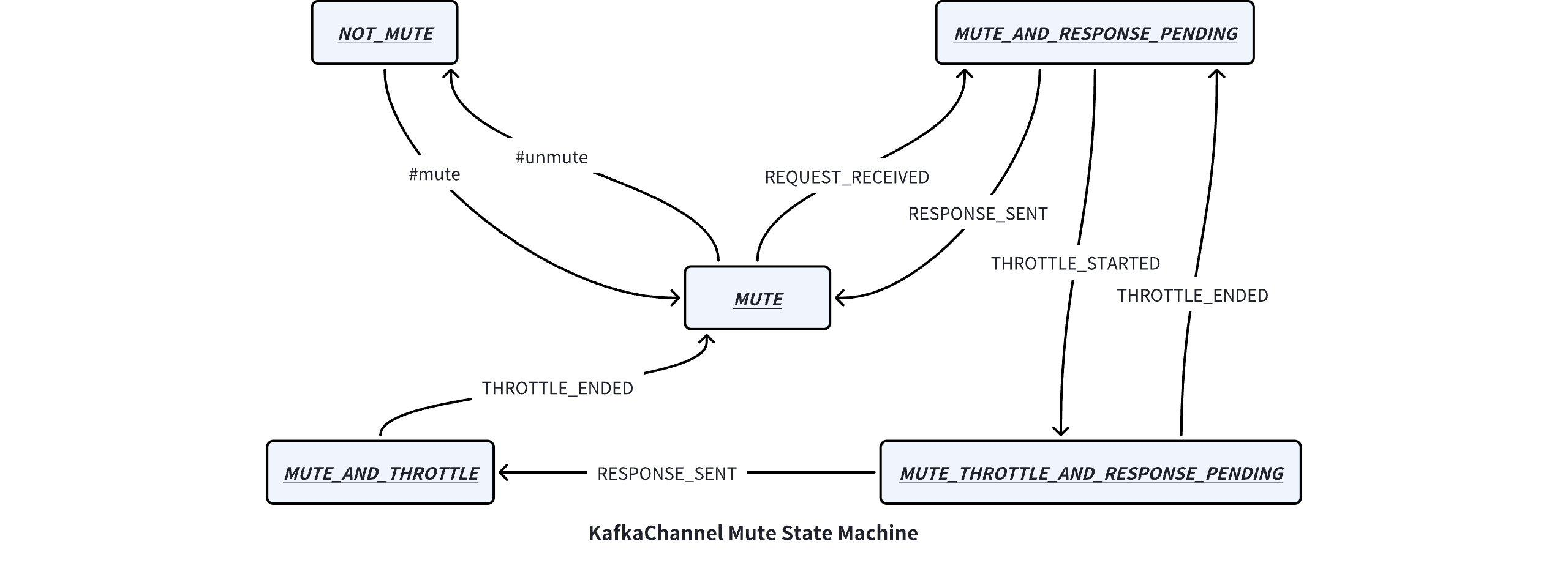 Receiving Requests: When a Processor parses a complete request from the network, it first adds the request to the RequestChannel, then calls the #mute method to change the KafkaChannel's state from NOT_MUTE to MUTE, and sends a REQUEST_RECEIVED event to transition to MUTE_AND_RESPONSE_PENDING state. Note: Until a corresponding response is received for this request, the Processor will not attempt to read more requests from connections that are not in the NOT_MUTE state (Processor#processCompletedReceives).