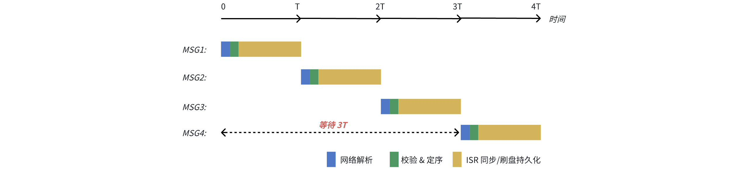 As illustrated below, even if the client sets max.in.flight.requests.per.connection = 5, MSG1 to MSG4 "arrive" at the server "simultaneously", MSG4 must wait until the previous three requests have been processed and responded before it can begin processing, resulting in a total send time for MSG4 of 4T.