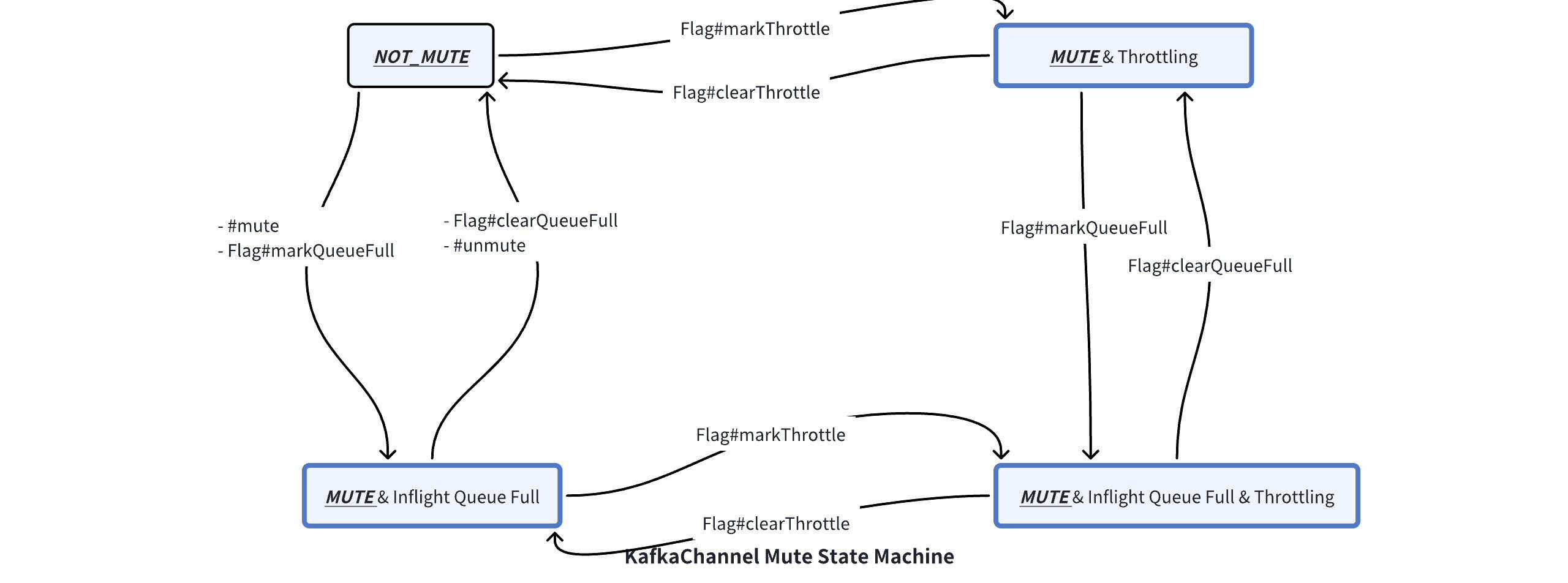 First, the state machine of KafkaChannel's mute state has been simplified, retaining only two states: MUTE and NOT_MUTE. Unlike before, it no longer mutes the corresponding connections upon receiving requests, nor does it serially process requests throughout the entire chain. This approach fully leverages the capabilities of the network parsing layer, continuously parsing new requests from connections. Additionally, to support Quota capabilities and prevent excessive Inflight requests from causing memory OOM, a Flag has been added to indicate the reasons for the current MUTE state. A connection will revert to a NOT_MUTE readable state only when the Flag is cleared.
