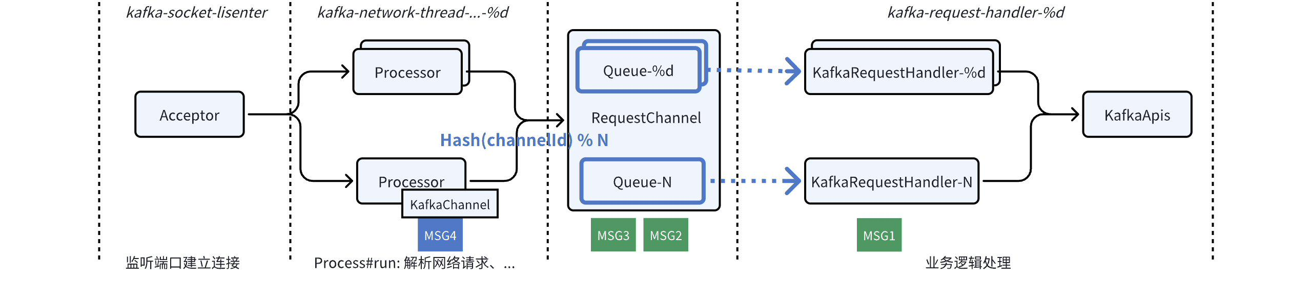 RequestChannel: After the Processor parses requests from the network, it places them into the single-queue RequestChannel, from where the KafkaRequestHandler pulls them for concurrent multi-threaded processing;