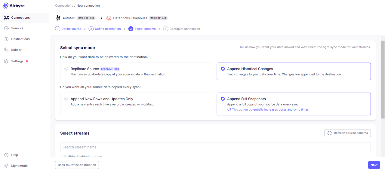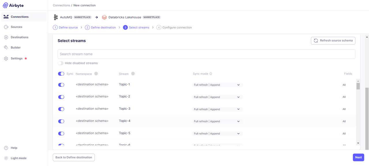 Both the data source and data endpoint are ready. Now we start to establish a connection. Select Airbyte from the left sidebar -> Connections -> Select data source and data endpoint -> Establish connection.