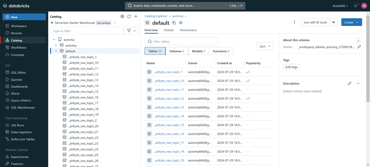We can see that the data from the selected Topics in the AutoMQ nodes has been successfully synchronized to Databricks. Next, data retrieval and processing can be performed using SQL. For specific syntax, please refer to the official documentation: [SQL language][11].