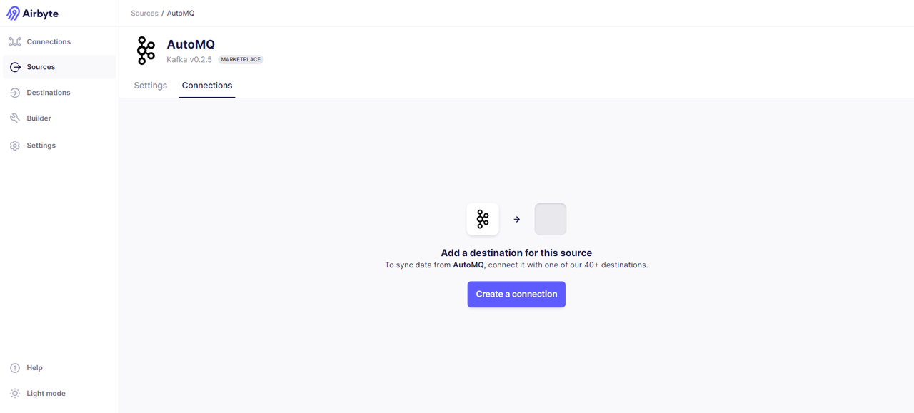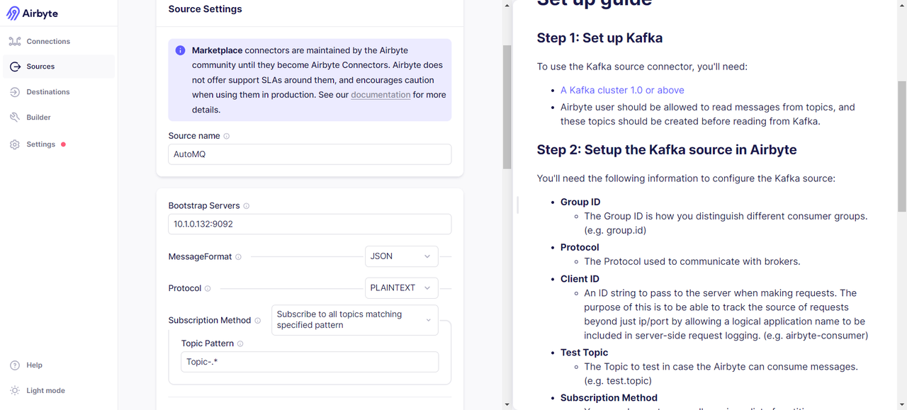 To add AutoMQ as a data source, leverage AutoMQ's full compatibility with Kafka; hence, the Kafka data source template can be utilized for setting up the AutoMQ data source. Through the Airbyte interface, navigate to the left sidebar -> Sources -> search for Kafka, and fill in basic information such as Bootstrap Servers, Protocol, Topic Pattern, etc.