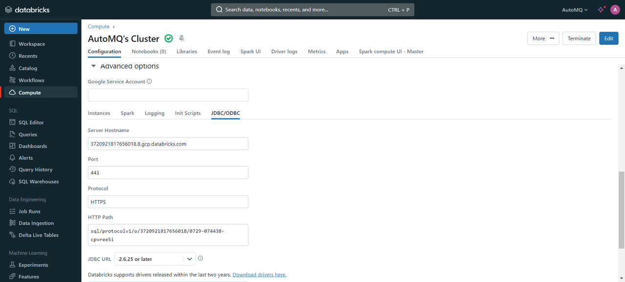 - Enter the created Databricks Cluster -> select Advanced Options -> JDBC/ODBC, where you can see the values for HTTP PATH and Server Hostname.