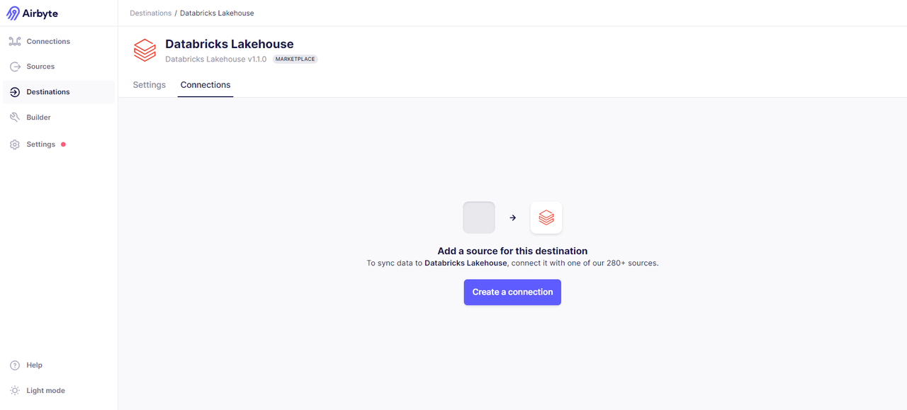 For the data endpoint, we have chosen Databricks. Of course, you can also choose other data endpoints. For a specific list, refer to: [Destinations | Airbyte] [10]. Navigate via the sidebar on the left of the Airbyte interface -> Destinations -> search for Databricks.