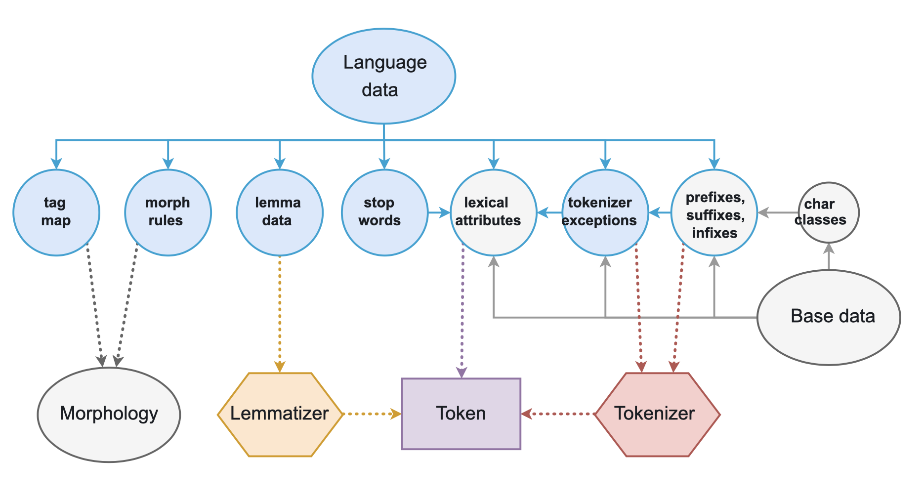 - spaCy language object contains multiple linguistic assets, not just an annotated corpus