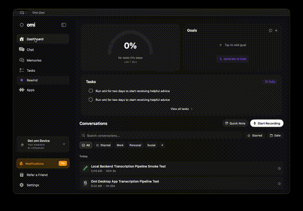 E2E Video Evidence (5 videos, signed URLs valid 7 days)Flow 1: Auth & Session BootstrapKill app → relaunch → session restored (no re-auth) Flow 2: Live Audio TranscriptionDesktop app → local backend ws://localhost:8000/v4/listen → Deepgram → 35 segments Flow 3: Screen Analysis SettingsSettings > General, Rewind, Privacy — all rendered Flow 4: NavigationDashboard → Chat → Memories → Tasks → Apps → Settings → back Local Backend Transcription PipelineApp wired to |