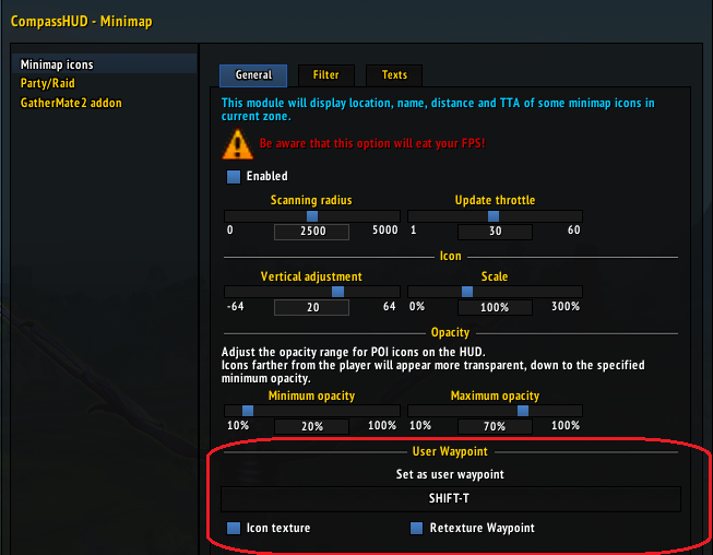 Minimap icons→Generalpane →User waypointgroup →Set as user waypoint