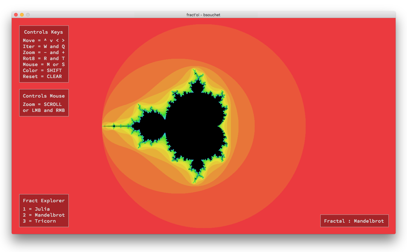 cd ~/Fractol && ./fractol JuliaYou have to launch the program with a parameter. This is the name of the fractal you would like to open at the execution of the program. This parameter as to be the name of a valid fractal (Julia, Mandelbrot or Tricorn).