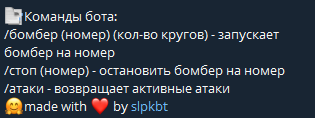 SMS Bomber Bot 𧨠Powered by bomber-apiπ£ ΠΡΠΎΡΡΠΎΠΉ Π½ΠΎ ΠΌΠΎΡΠ½ΡΠΉ SMS Bomber ΠΏΡΡΠΌΠΎ Π² ΡΠ΅Π»Π΅Π³ΡΠ°ΠΌ Π±ΠΎΡΠ΅. ΠΠΈΠΊΠ°ΠΊΠΈΡ Π»ΠΈΠΌΠΈΡΠΎΠ²β ΠΠΎΠ»ΡΡΠΎΠ΅ ΠΊΠΎΠ»ΠΈΡΠ΅ΡΡΠ²ΠΎ ΡΠ΅ΡΠ²ΠΈΡΠΎΠ², ΡΡΠ΅Π΄ΠΈ ΠΊΠΎΡΠΎΡΡΡ Π΅ΡΡΡ ΠΈ "Π·Π²ΠΎΠ½ΡΡΠΈΠ΅"π² ΠΡΠ΅ Π½Π΅ΠΎΠ±Ρ ΠΎΠ΄ΠΈΠΌΡΠ΅ ΠΊΠΎΠΌΠ°Π½Π΄Ρ Π΄Π»Ρ ΡΠ°Π±ΠΎΡΡ Ρ Π±ΠΎΠΌΠ±Π΅ΡΠΎΠΌ.π ΠΠΎΠ΄Π΄Π΅ΡΠΆΠΊΠ° Π²ΡΠ΅Ρ Π‘ΠΠ ΡΡΡΠ°Π½ π§πΎ/π°πΏ/π·πΊ/πΊπ¦ ΠΠΎΠΌΠ°Π½Π΄Ρ /Π±ΠΎΠΌΠ±Π΅Ρ (Π½ΠΎΠΌΠ΅Ρ) (ΠΊΠΎΠ»-Π²ΠΎ ΠΊΡΡΠ³ΠΎΠ²) - Π·Π°ΠΏΡΡΠΊΠ°Π΅Ρ Π±ΠΎΠΌΠ±Π΅Ρ Π½Π° Π½ΠΎΠΌΠ΅Ρ /ΡΡΠΎΠΏ (Π½ΠΎΠΌΠ΅Ρ) - ΠΎΡΡΠ°Π½ΠΎΠ²ΠΈΡΡ Π±ΠΎΠΌΠ±Π΅Ρ Π½Π° Π½ΠΎΠΌΠ΅Ρ /Π°ΡΠ°ΠΊΠΈ - Π²ΠΎΠ·Π²ΡΠ°ΡΠ°Π΅Ρ Π°ΠΊΡΠΈΠ²Π½ΡΠ΅ Π°ΡΠ°ΠΊΠΈ ΠΡΠΈΠΌΠ΅Ρ Π·Π°ΠΏΡΡΠΊΠ° Π°ΡΠ°ΠΊΠΈ Π‘ΠΏΠΈΡΠΎΠΊ Π°ΡΠ°ΠΊ ΠΡΡΠ°Π½ΠΎΠ²ΠΊΠ° Π°ΡΠ°ΠΊΠΈ Π£ΡΡΠ°Π½ΠΎΠ²ΠΊΠ° Π ΠΏΠ°ΠΏΠΊΠ΅ Ρ Π±ΠΎΡΠΎΠΌ Π²ΡΠΏΠΎΠ»Π½ΠΈΡΠ΅ ΠΊΠΎΠΌΠ°Π½Π΄Ρ: npm i πΠΡΠΏΠΎΠ»ΡΠ·ΡΠ΅ΠΌΡΠ΅ ΠΌΠΎΠ΄ΡΠ»ΠΈ: bomber-api - ΠΡΠΏΠΎΠ»ΡΠ·ΡΠ΅ΡΡΡ Π΄Π»Ρ ΠΎΡΠ½ΠΎΠ²Π½ΠΎΠ³ΠΎ ΡΡΠ½ΠΊΡΠΈΠΎΠ½Π°Π»Π° Π±ΠΎΡΠ° telegraf β ΠΠ°ΡΡΡΠΎΠΉΠΊΠ° ΠΠ°ΠΌ Π½Π΅ΠΎΠ±Ρ ΠΎΠ΄ΠΈΠΌΠΎ Π½Π°ΡΡΡΠΎΠΈΡΡ config.json Π² ΠΏΠ°ΠΏΠΊΠ΅ config token - ΡΠΎΠΊΠ΅Π½ Π±ΠΎΡΠ° adminlist - ΡΠΏΠΈΡΠΎΠΊ ΠΏΠΎΠ»ΡΠ·ΠΎΠ²Π°ΡΠ΅Π»Π΅ΠΉ, ΠΊΠΎΡΠΎΡΡΠ΅ ΠΌΠΎΠ³ΡΡ ΠΈΡΠΏΠΎΠ»ΡΠ·ΠΎΠ²Π°ΡΡ Π±ΠΎΡΠ°. ΠΡΡΠ°Π²ΡΡΠ΅ ΡΡΠ΄Π° ΡΠ²ΠΎΠΉ id