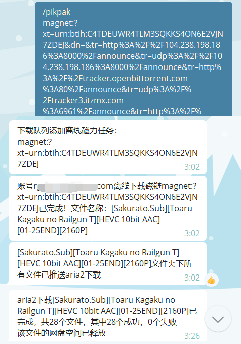 自动PikPak离线下载+aria2下载+释放网盘空间的TG机器人