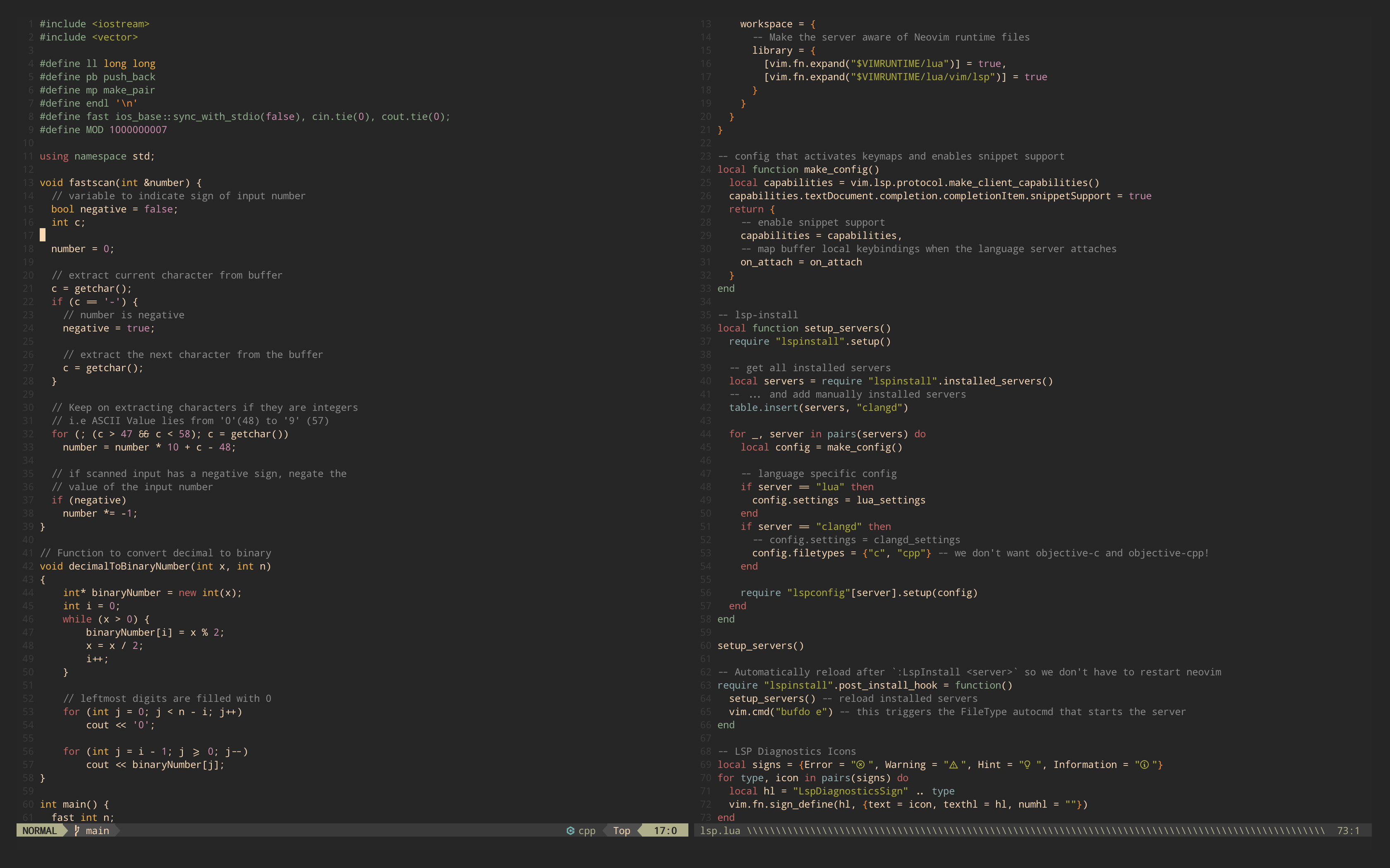 | Nvim Lua dotfiles. Treesitter/LSP/Telescope/Compe included.