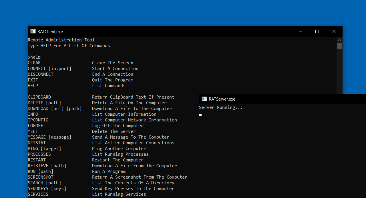 Remote Admin Tool is a Command Line Interface Tool for administrating a network over a TCP connection. Extremely simple and modular containing over 30 commands.