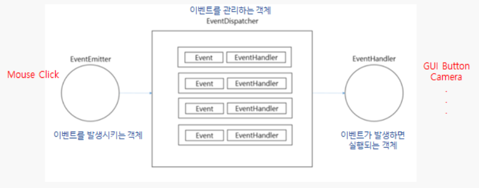 - EventEmitter에서 마우스 클릭과 같은 이벤트를 발생시키면 EventEmitter에서 실행되는 메소드들이 EventHandler가 되며, 이 둘을 바인딩시킨 것이 EventDispatcher가 된다.