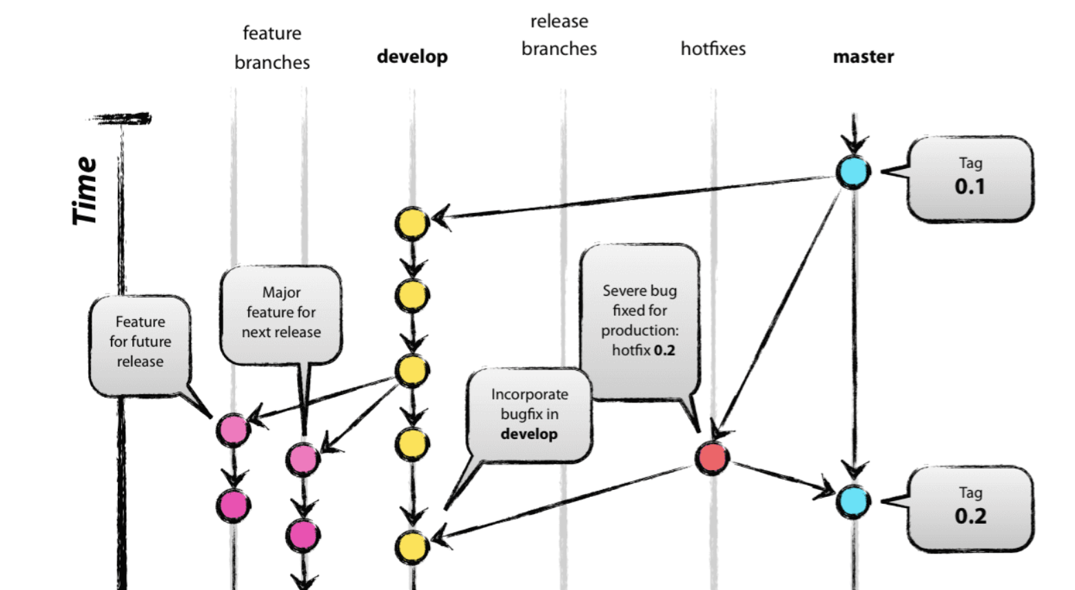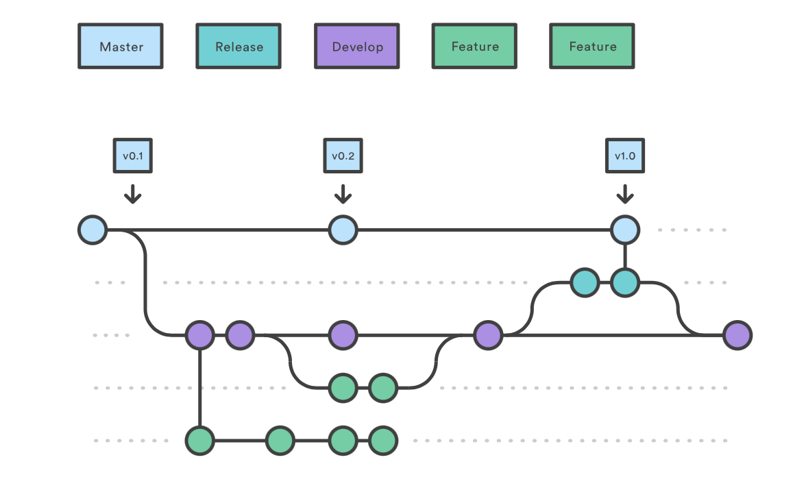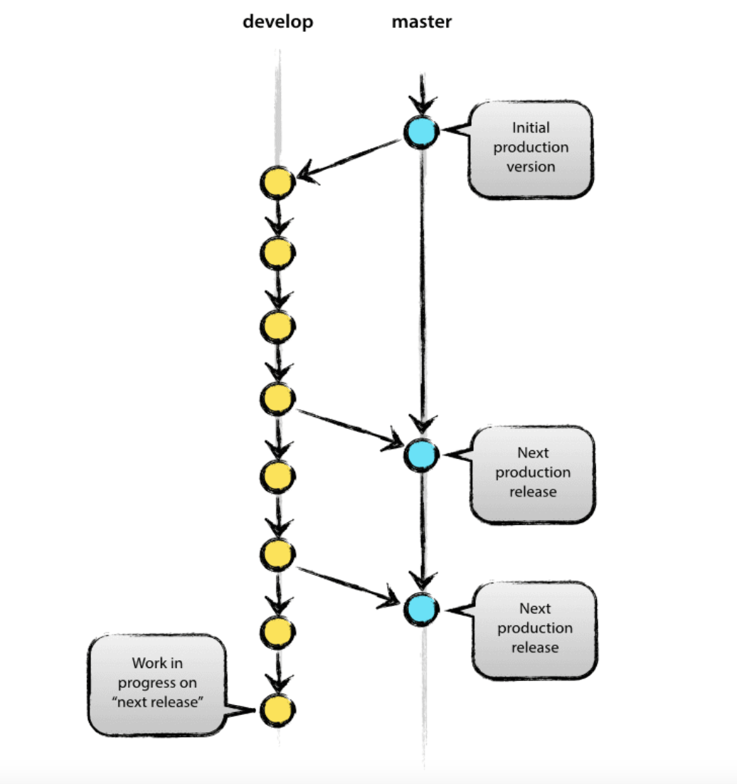 기능 개발을 위한 브랜치들을 병합하기 위해 사용. 즉, 모든 기능이 추가되고 버그가 수정되어 배포 가능한 안정적인 상태라면 develop 브랜치를 ‘master’ 브랜치에 병합(merge)한다.