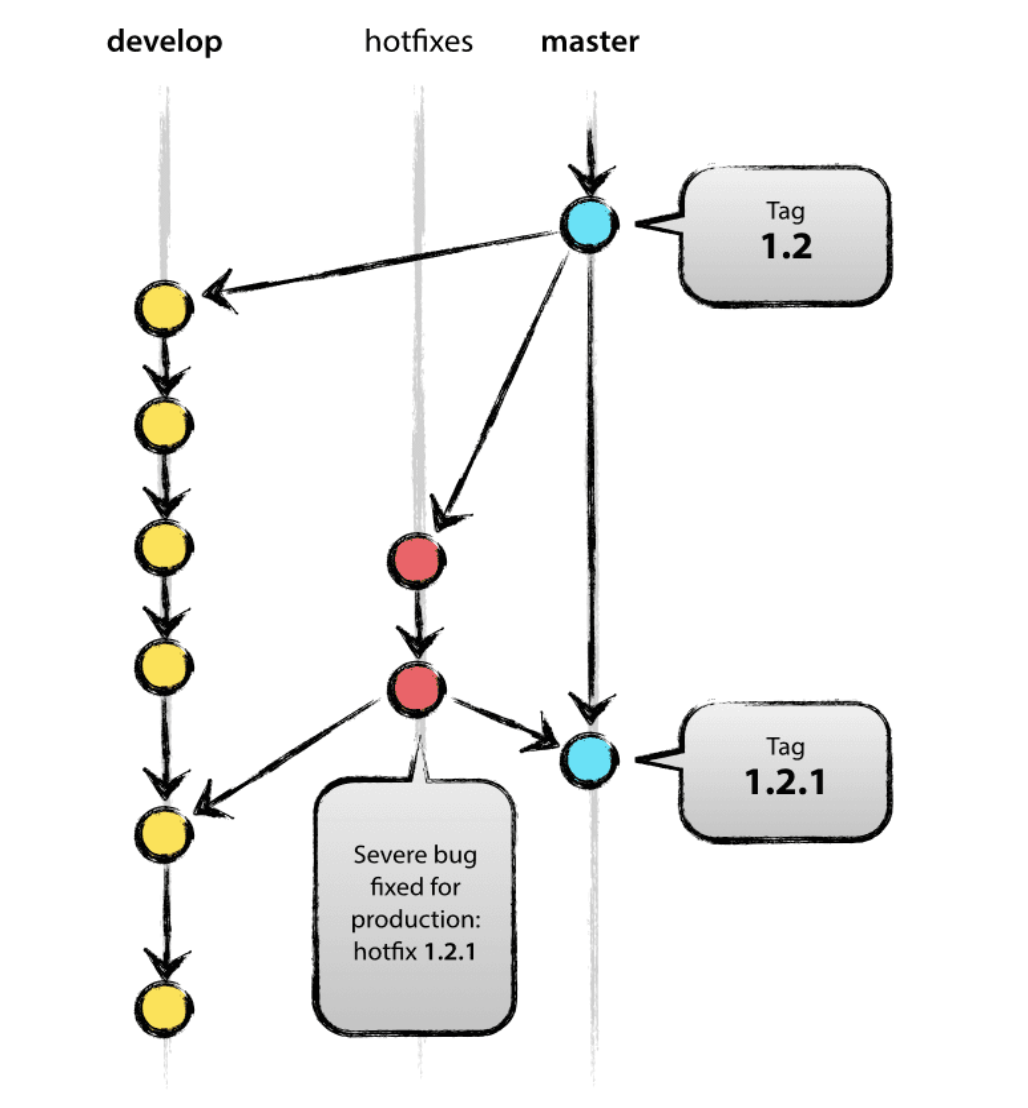‘develop’ 브랜치에서 문제가 되는 부분을 수정하여 배포 가능한 버전을 만들기에는 시간도 많이 소요되고 안정성을 보장하기도 어려우므로 바로 배포가 가능한 ‘master’ 브랜치에서 직접 브랜치를 만들어 필요한 부분만을 수정한 후 다시 ‘master’브랜치에 병합하여 이를 배포해야 하는 것이다.