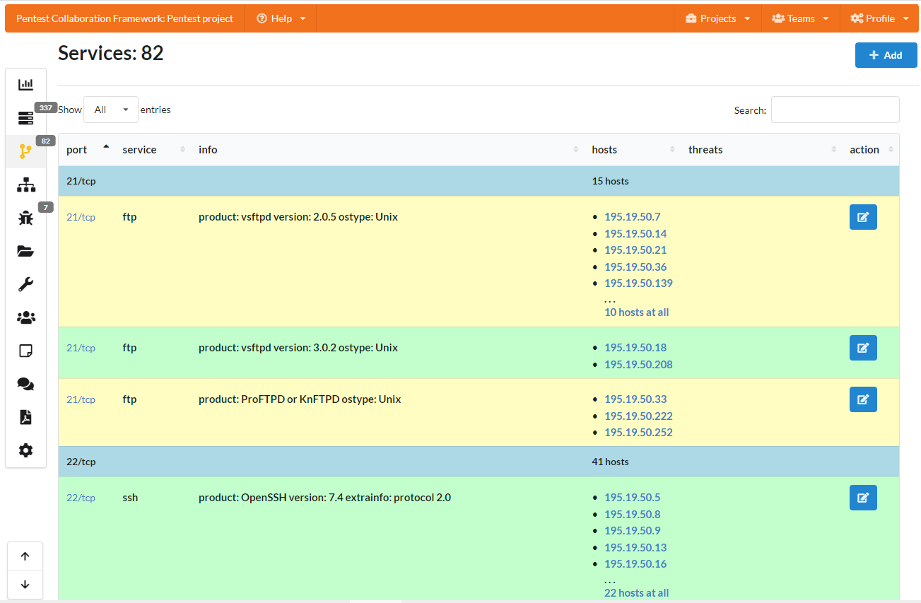 | Nmap | Import | Import XML results (ip, port, service type, service version, hostnames, os). Supported plugins: vulners |