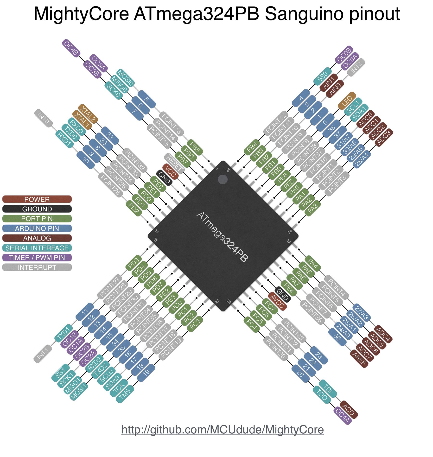 | MightyCore Standard pinout | MightyCore Bobuino pinout | MightyCore Sanguino pinout |