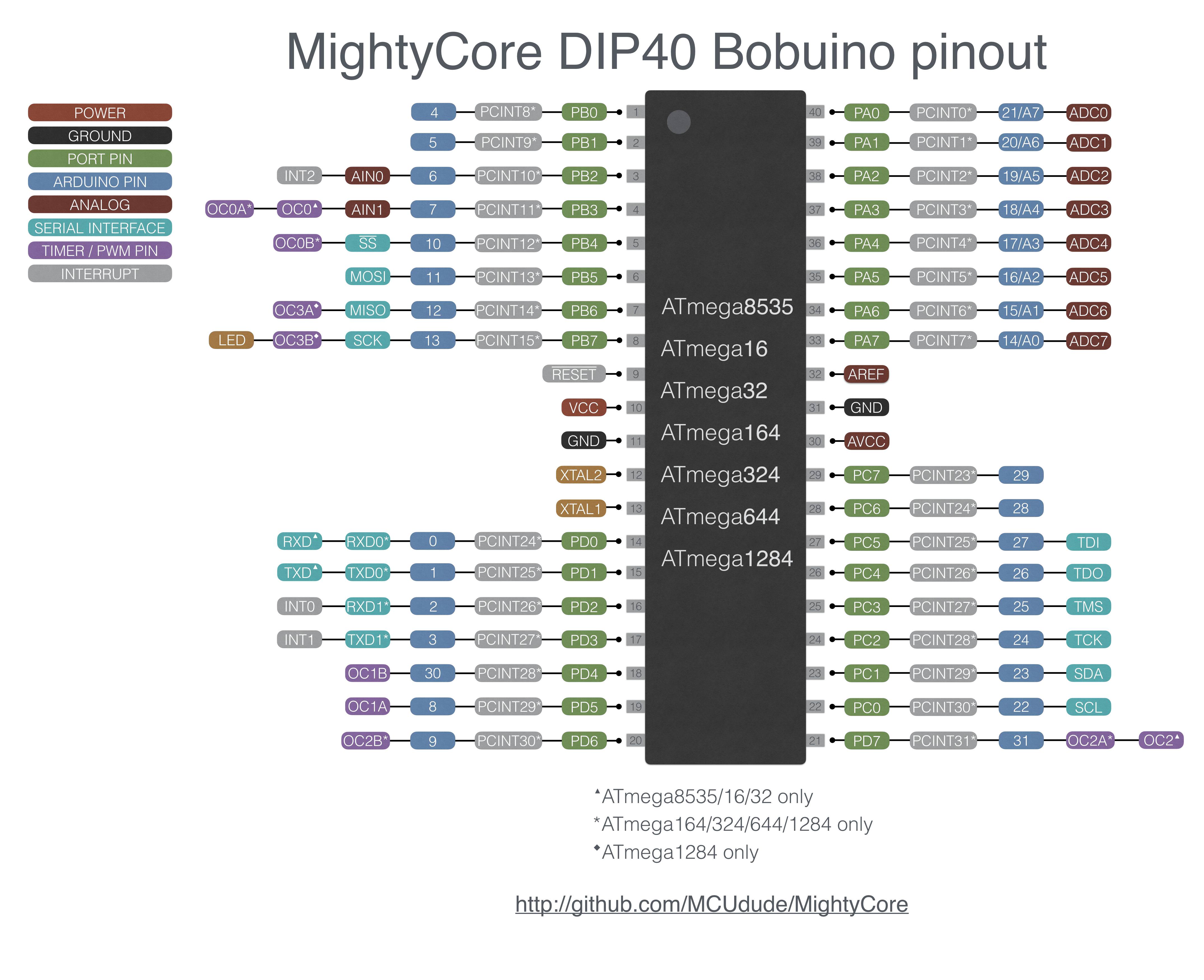 - Bobuino: Basically an Arduino UNO pinout setting. This pinout version is great for using with shields or code that's written for the Arduino UNO, as the pin functions stay the same (MOSI on D11, MISO on D12, SCK on D13).