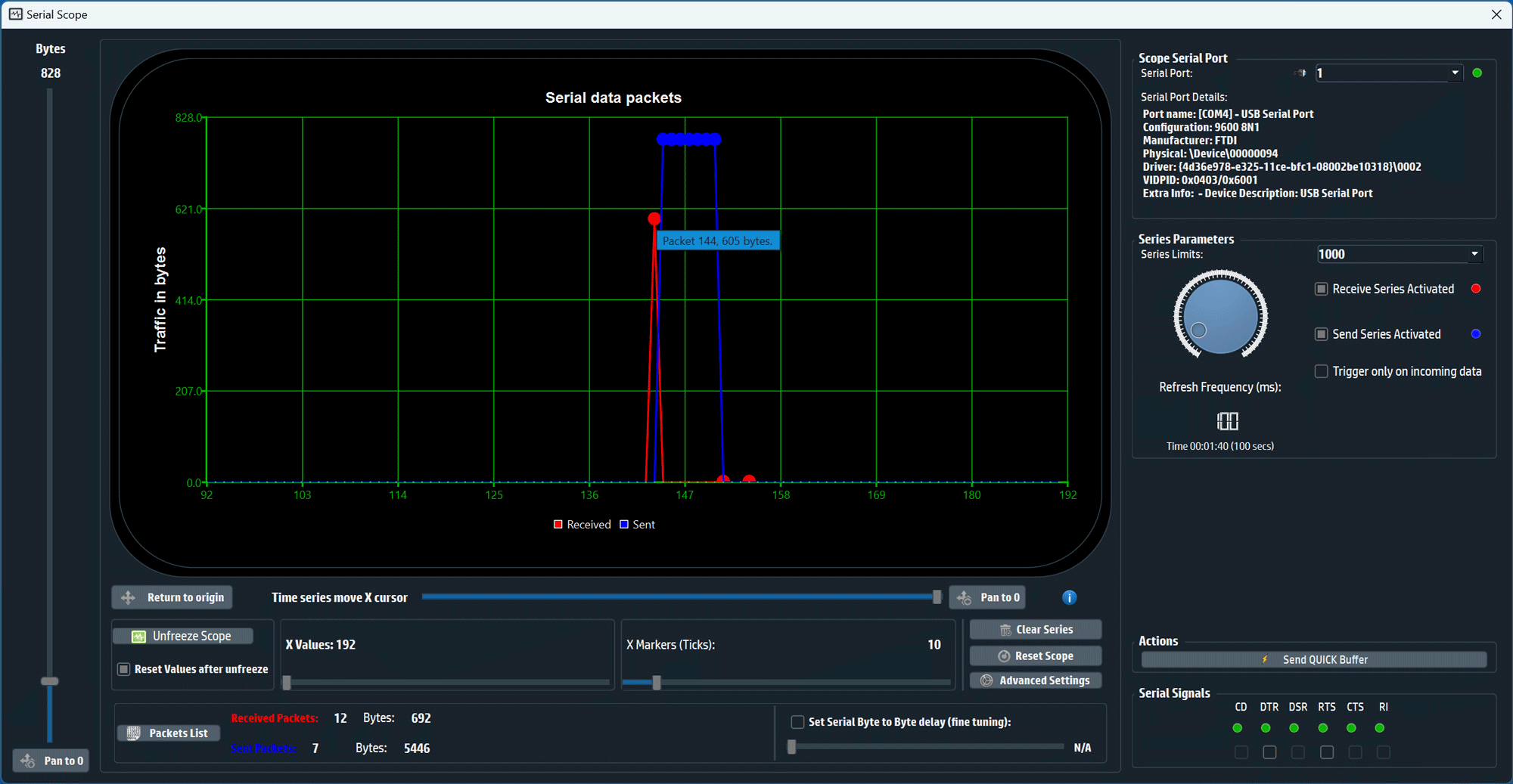 For deeper insight, SerialTool offers a serial sniffer kernel driver (on Windows) that captures low-level I/O control (IOCTL) signals and raw serial data, even from ports opened by other applications. It features a live session log, byte visualizer, structured packet list, IO controls, and a SerialScope for graphical waveform analysis.