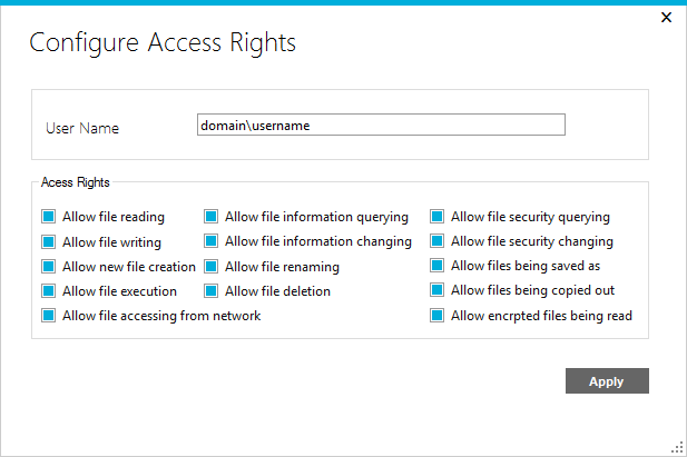 To set the access rights to the specific users or processes by clicking "Add User Rights" and "Add Process Rights" buttons: to allow or disallow the file deletion, file writing, file execution, file creation, file renaming, security change, file being copied out, file reading, file being accessed from network, hiding the files, file encryption.