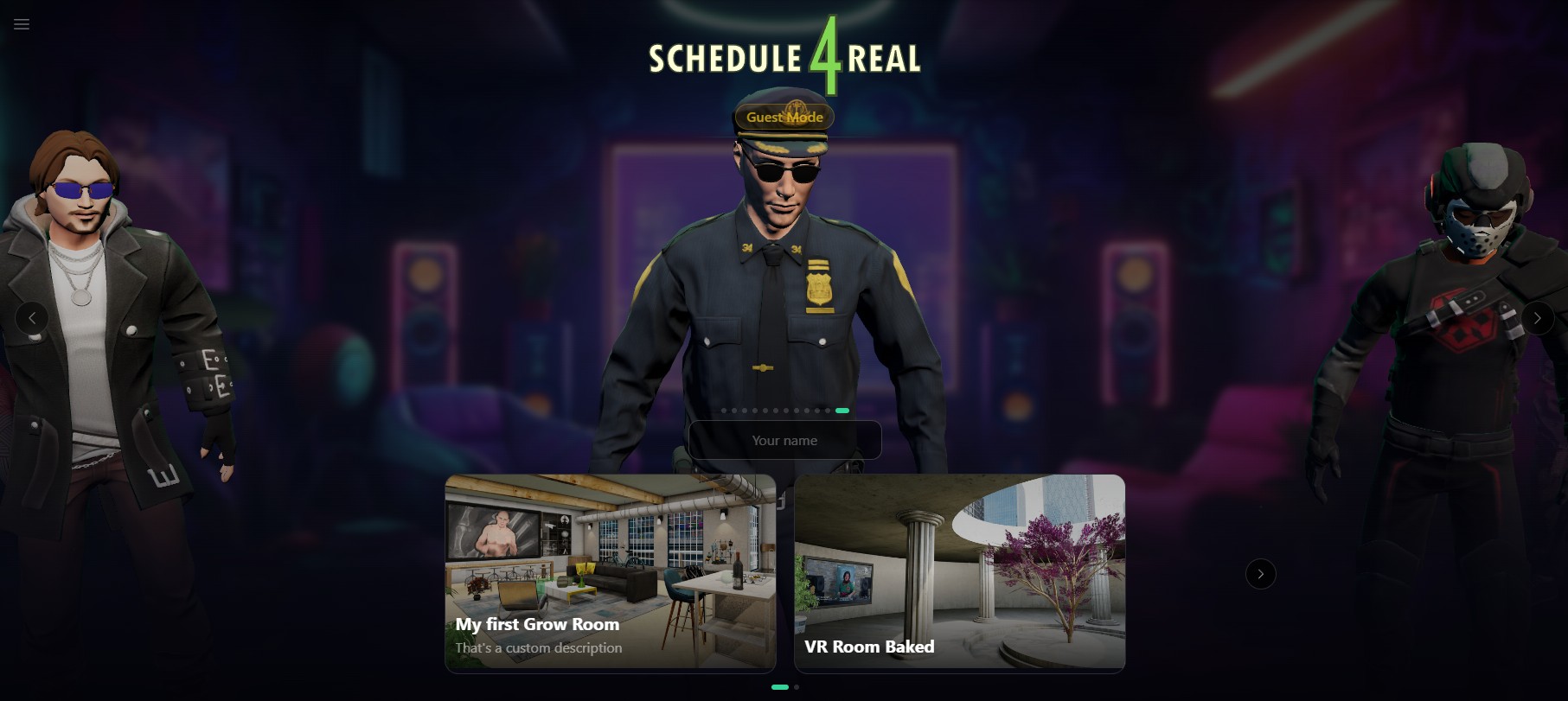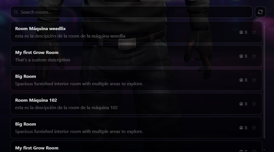 The lobby is your starting point. Pick a character, browse your rooms or discover public ones, and step into any 3D environment. Create rooms by uploading custom GLB models — your actual grow tent, an apartment, a warehouse, whatever you want.