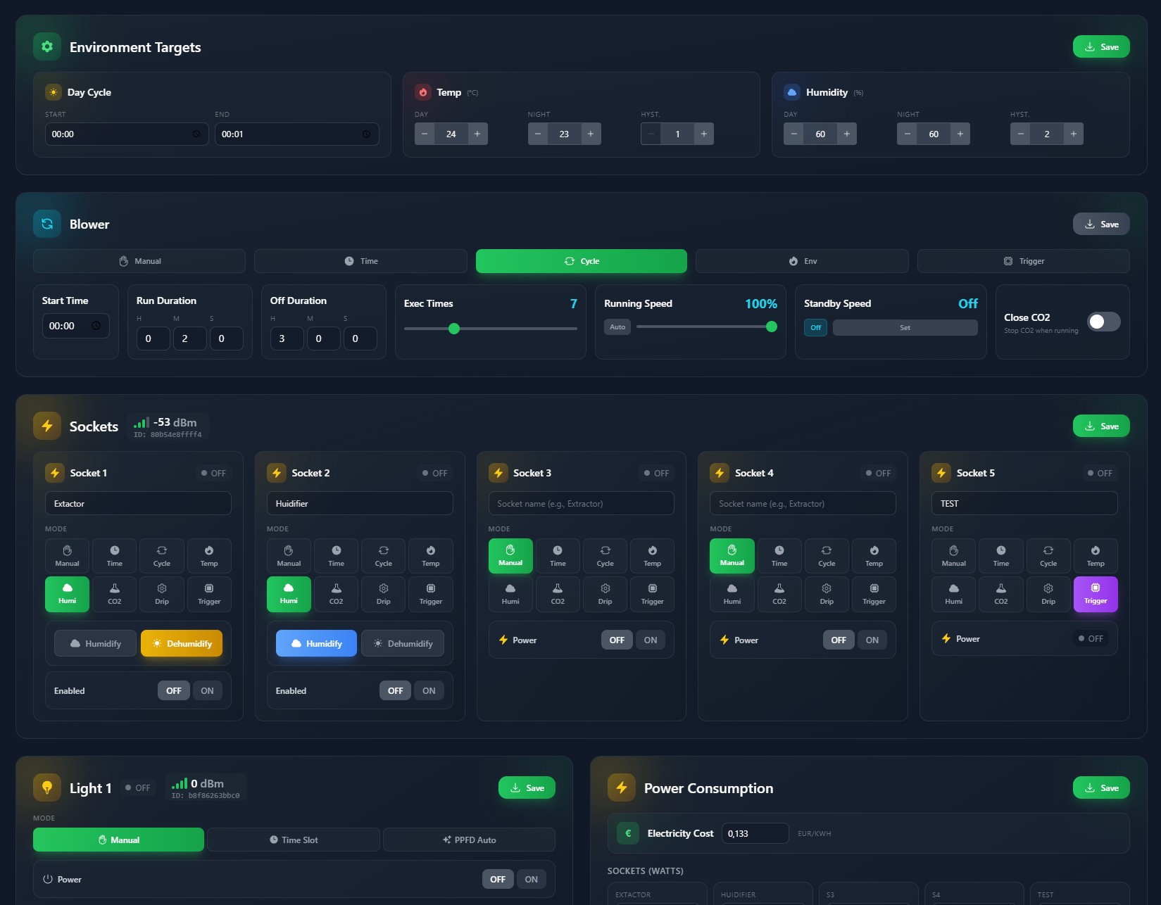 - Environment sensors — Temperature, humidity, VPD (air + leaf), CO2, updated every few seconds