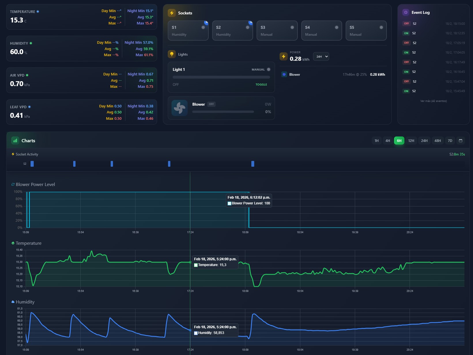 - Charts — Temperature, humidity, VPD, CO2, wattage, blower/fan — from 1 hour to 90 days, with day/night shading and synced crosshair across all charts