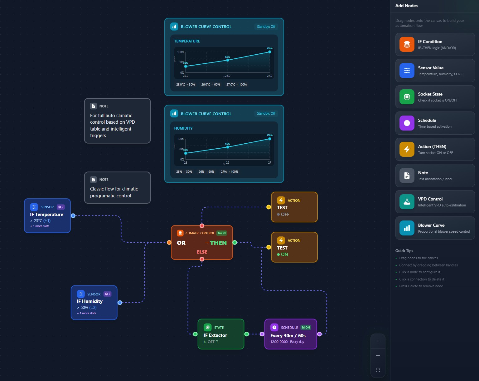 A visual node-based flow builder for creating complex automation rules — purpose-built for grow rooms.