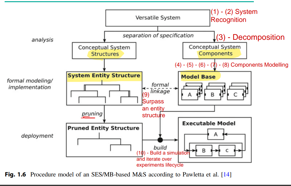Figure 1.7 shows an example of an SES with associated MB. In the application phase, executable models are generated with transformation methods such as pruning and build. Based on defined objectives, the pruning method derives a unique system configuration from the set of possible configurations. The result of pruning is called Pruned Entity Structure (PES). Based on the information in the PES, the build method generates an Executable Model using basic systems from the MB.