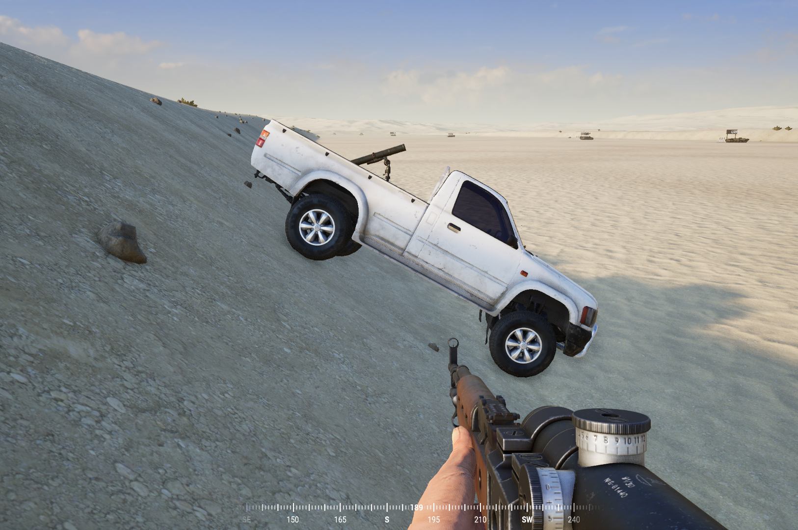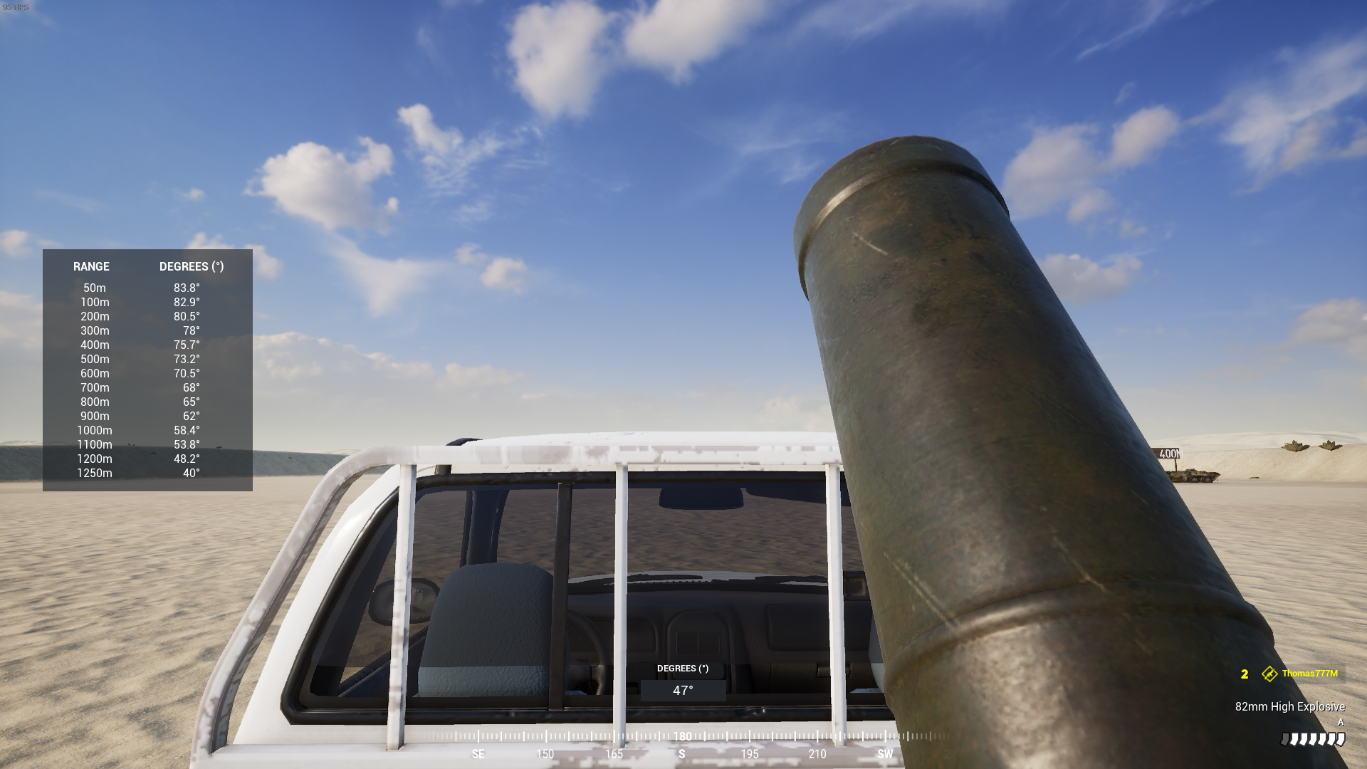 I wasn't clear : the max distance is around 1230m not because of the mortar velocity but because of the lower angle you can go on these mortars when the vehicule is completly horizontal : 38.3. You can in theory go lower by leaning the vehicule (screenshot below) but it's not recommanded : the car will move at each shot. You can even do direct shots. Obviously the angles calculated with an average 110.5 velocity are either too short (eg: 170m too short when shooting at 1000m !) or impossible too use (<38.3) We can either use a different velocity according to the distance based on owi's angle or ask OWI what they changed on the formula. I've checked wikipedia air resistance formula but it's out of my competences. For futur reference :