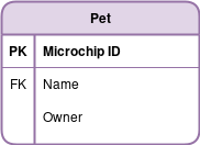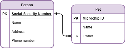 In the example below, we illustrate the relationship between Pet and Person. A Person can have zero or many Pets, and a Pet belongs to one and only one Person (think only one Person can purchase a Pet). It is also common practice to have the connector directly link from PK to any exported FK.