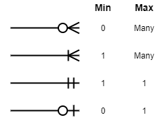 Entities are great, but the magic of a database is that it pools together the needed tables to deliver information to whoever requests. To illustrate how the database combines tables we need to tell it what to do! Each Entity will have a line that connects it to another Entity, and these lines specify the minimum and maximum number of entities involved in each side of a relationship. We will use the following connectors: