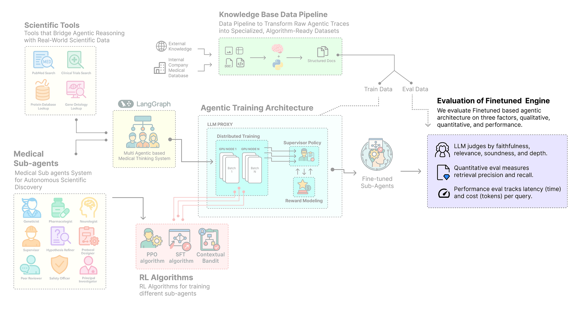 - After that, we begin the main Reinforcement Learning (RL) loop for our Senior Researchers. We run our VERL (PPO) algorithm. In this phase, the system collects new data using the improved junior agents and performs online policy updates on the Llama-3 model, using our multi-faceted reward signal to teach it how to design better experimental protocols.