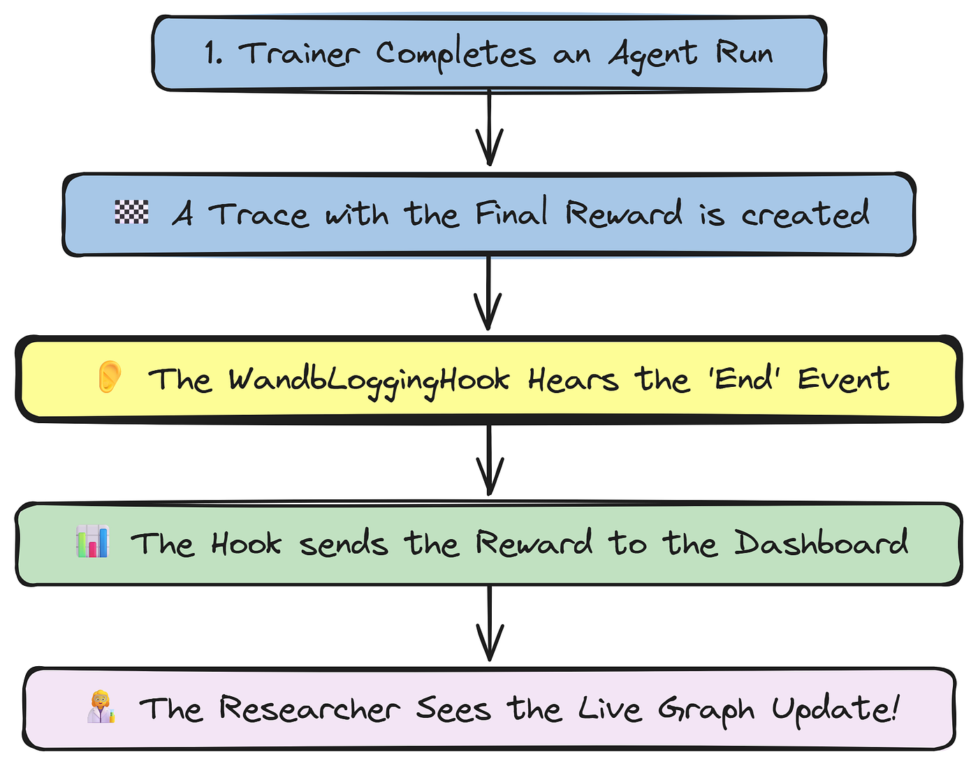 - Simultaneously, we monitor the agent’s progress in real time. Our WandbLoggingHook listens for the end of every single PPO rollout, immediately logging the final reward to Weights & Biases. This gives us a live, streaming learning curve to track performance.